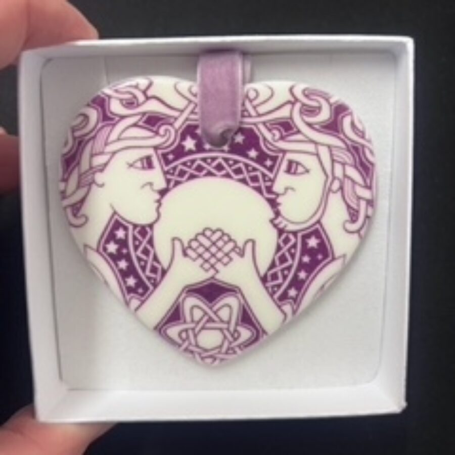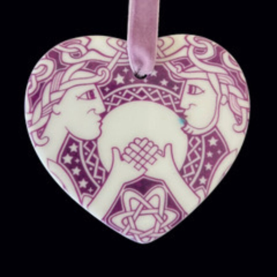 A beautiful ceramic hanging direction featuring an original Celtic couple design by Highland Celtic Art. The ribbon may vary but will either come in a complimentary tartan or velvet and is 1 cm in diameter. Each hanger comes boxed.