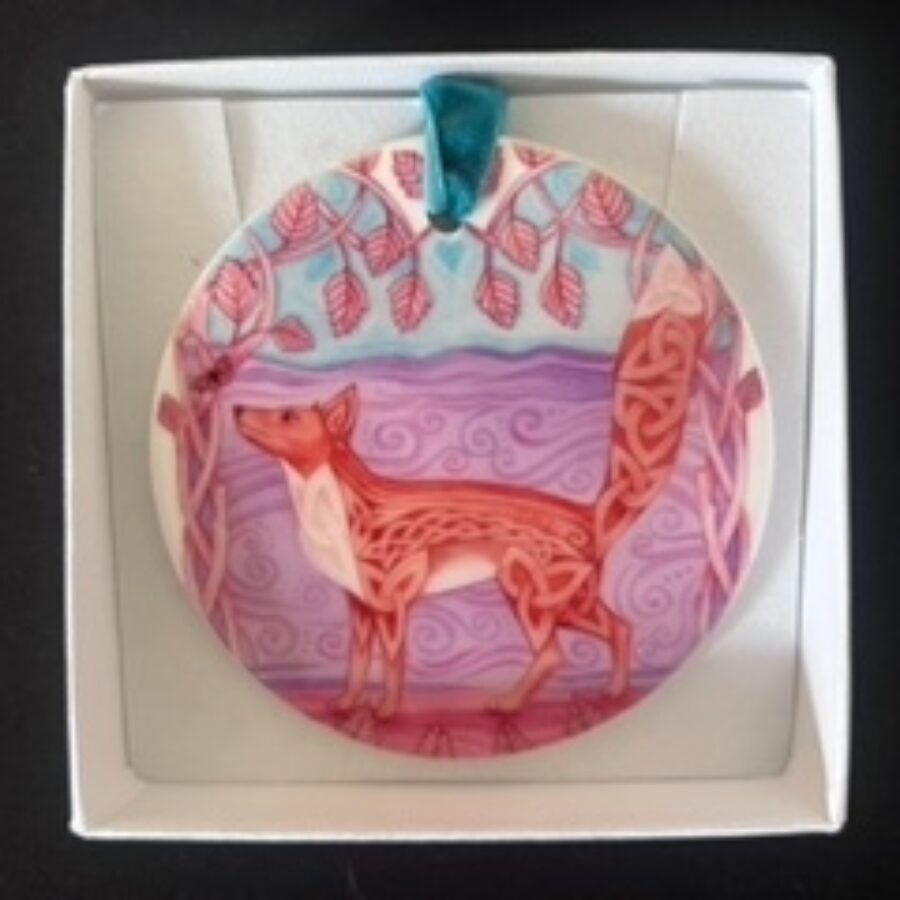 A beautiful ceramic hanging decoration featuring an original design of a Celtic Fox by Highland Celtic Art. The ribbon colour may vary and is 1 cm in diameter. Each hanger comes boxed.
