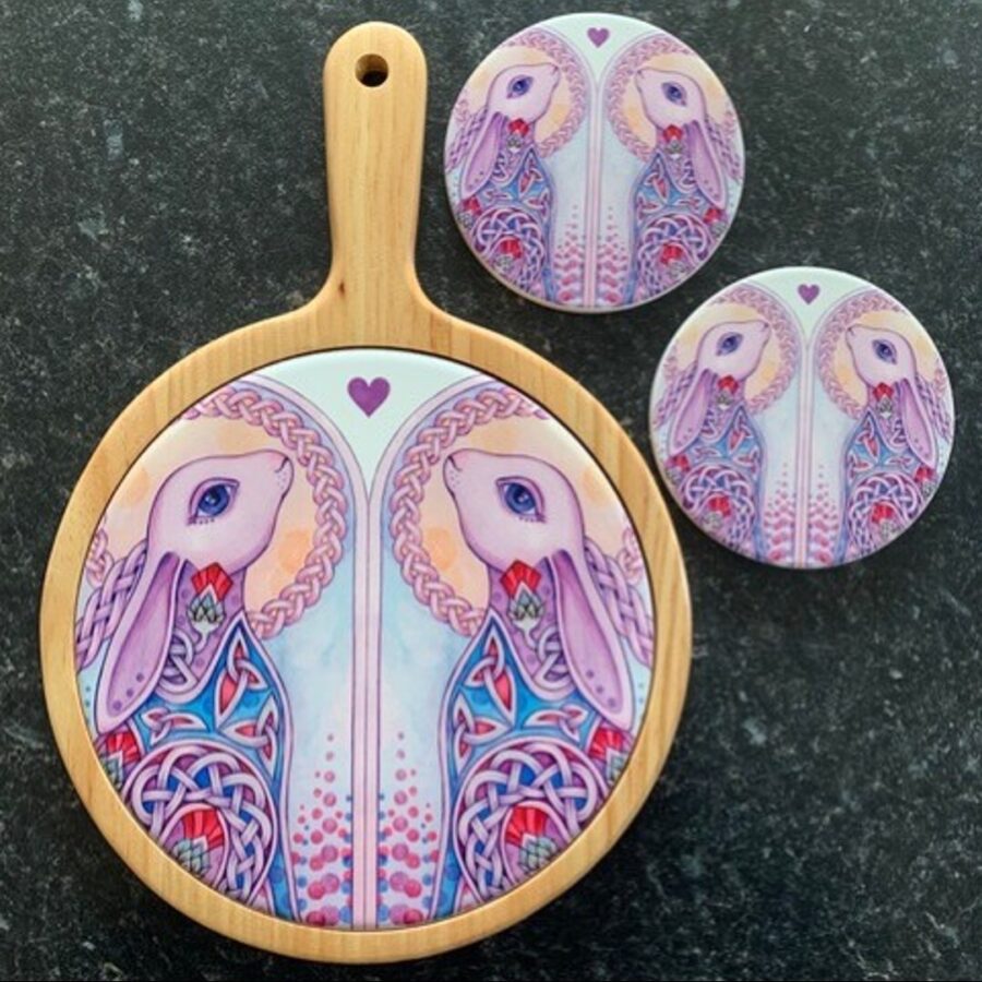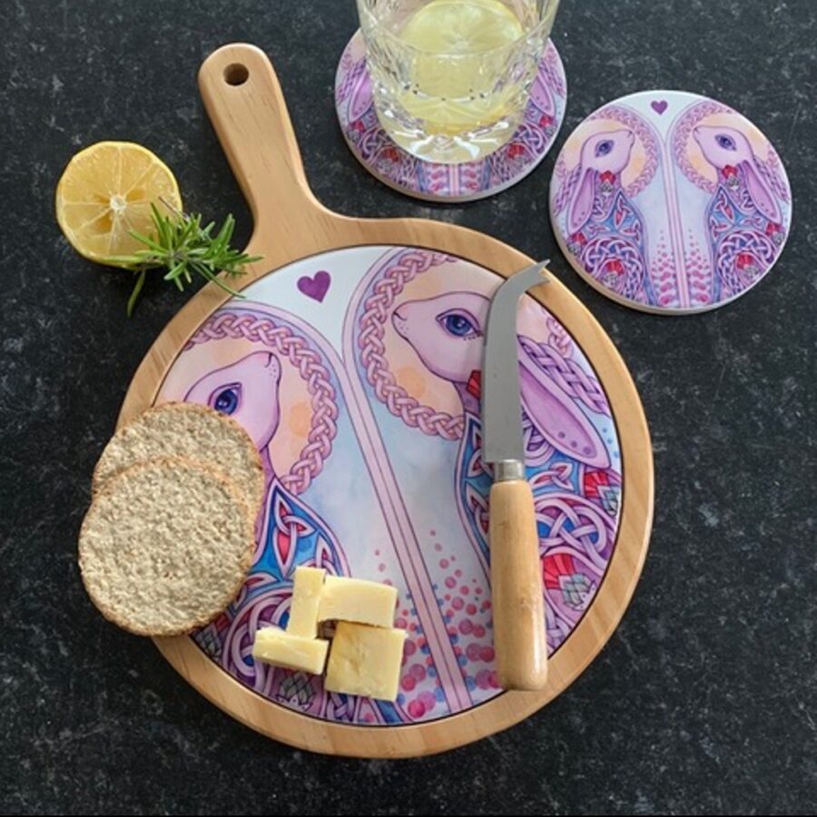 A beautiful cheese board and coaster set featuring a Celtic hare design. The cheeseboard has a handle for easy handling and a round ceramic tile in the middle section. The cheese board makes the perfect gift for family and friends or a special treat for yourself to entertain guests. The image on the tile is heat pressed on to the tiles so can be wiped clean. the ceramic coasters are 10.5 cm wide and 1 cm deep with a cork base.