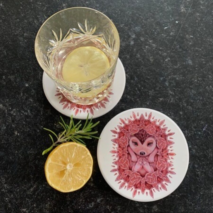 A beautiful cheese board and coaster set featuring a Celtic hedgehog design. The cheeseboard has a handle for easy handling and a round ceramic tile in the middle section. The cheese board makes the perfect gift for family and friends or a special treat for yourself to entertain guests. The image on the tile is heat pressed on to the tiles so can be wiped clean. the ceramic coasters are 10.5 cm wide and 1 cm deep with a cork base.