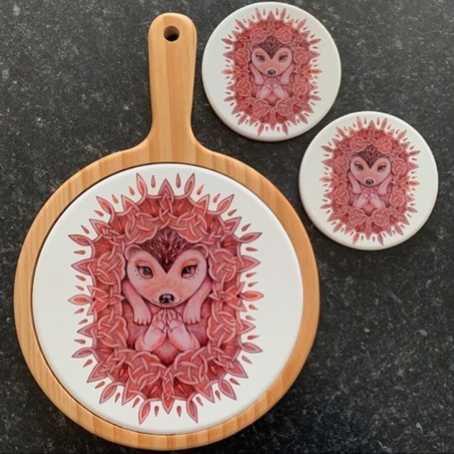 Celtic Hedgehog Wooden Cheeseboard and Coaster Set
