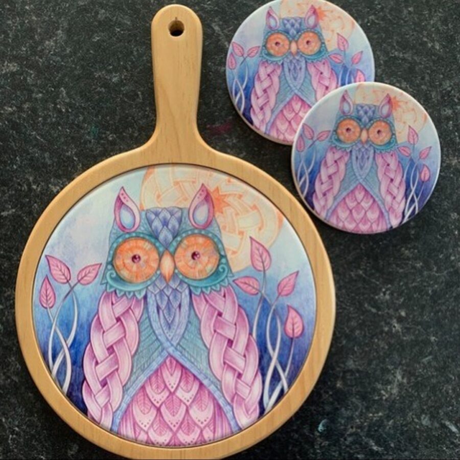 Celtic Owl Wooden Cheeseboard and Coaster Set