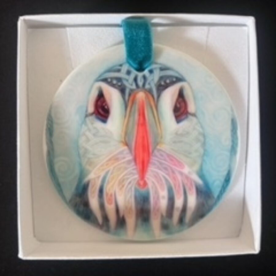 A beautiful ceramic hanging decoration featuring an original design of a Celtic Puffin by Highland Celtic Art. The ribbon colour may vary and is 1 cm in diameter. Each hanger comes boxed.