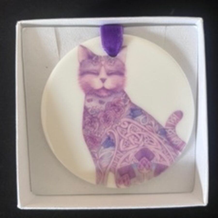 A beautiful ceramic hanging decoration featuring an original design of a Celtic Purple Cat by Highland Celtic Art. The ribbon colour may vary and is 1 cm in diameter. Each hanger comes boxed.