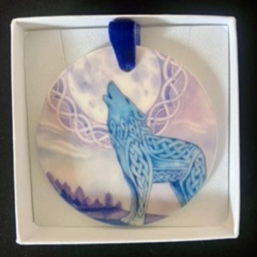 A beautiful ceramic hanging decoration featuring an original design of a Celtic Wolf by Highland Celtic Art. The ribbon colour may vary and is 1 cm in diameter. Each hanger comes boxed.