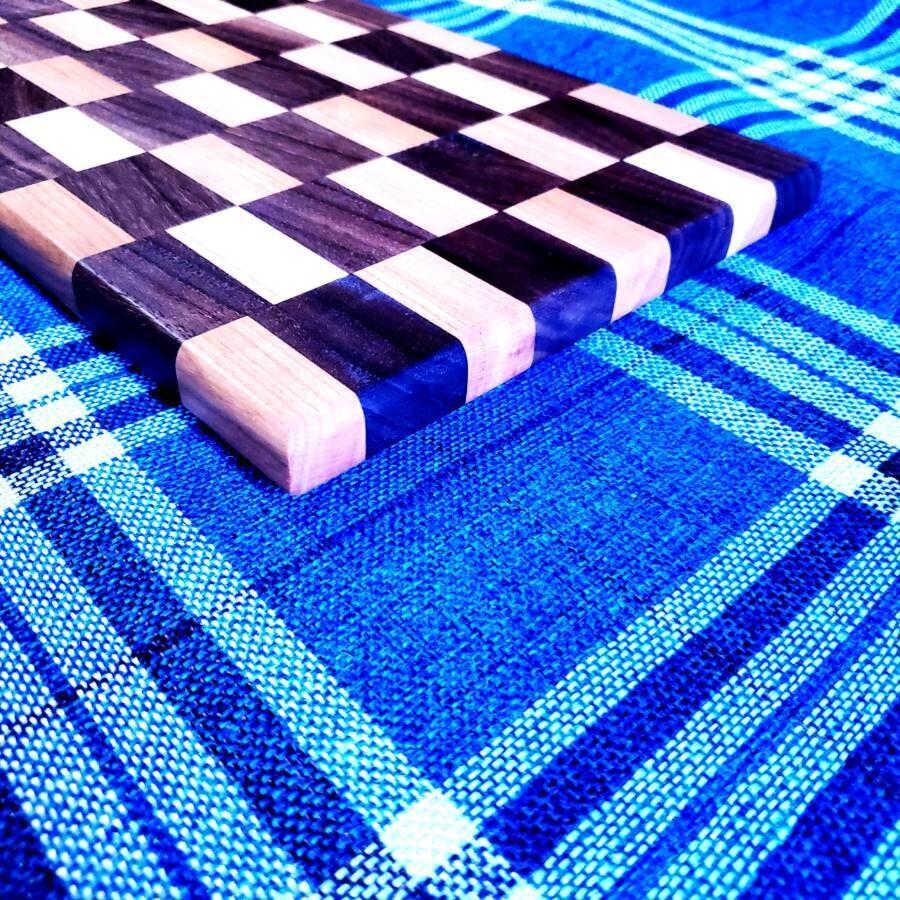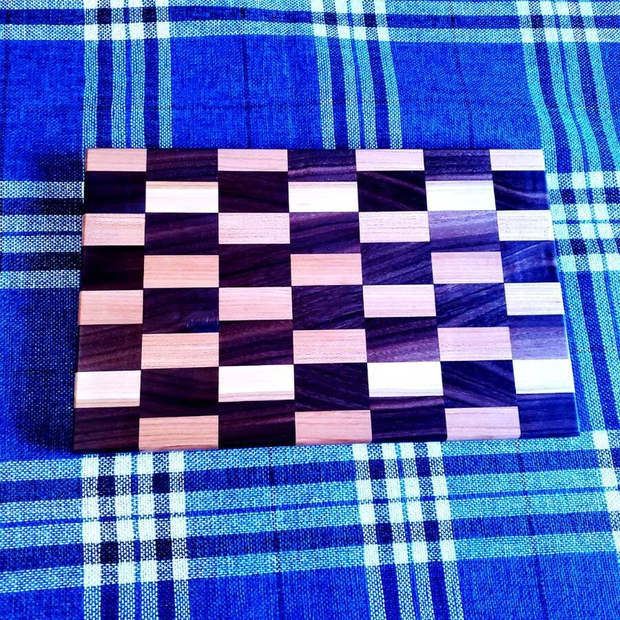A stunning chopping board in a chequer pattern made from American Black Walnut and American Cherry. A chamfer on one face allows for easier lifting from work surfaces. A small round over on the opposite face gives a pleasing modern feel. Sanded to 220 grit and finished first in mineral oil then a food safe oil wax mix. Sure to delight any chef. As wood is a natural product, grain pattern may vary slightly from images