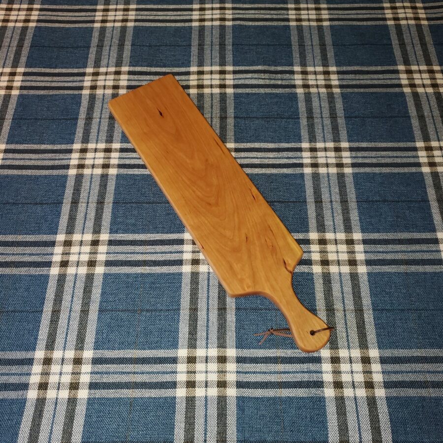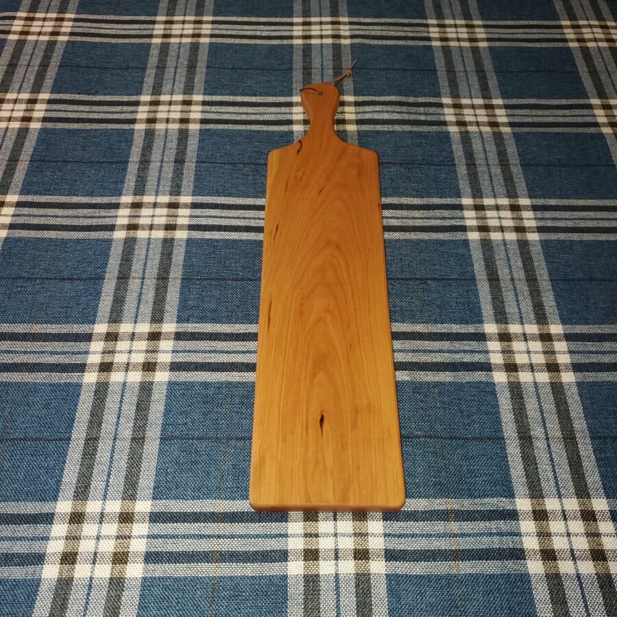 A beautiful paddle style charcuterie board made from cherry, finished with mineral oil and a final application of a food safe oil/wax treatment. Complete with a leather tie for that final touch. Sure to delight any food lover. As wood is a natural product grain pattern will vary from piece to piece