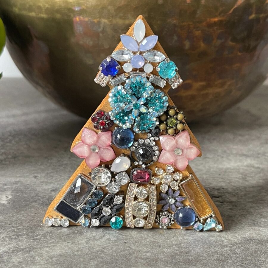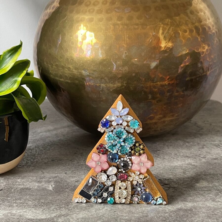A Christmas Tree jewelled ornament made from 18mm thick MDF, painted and decorated with upcycled jewels.