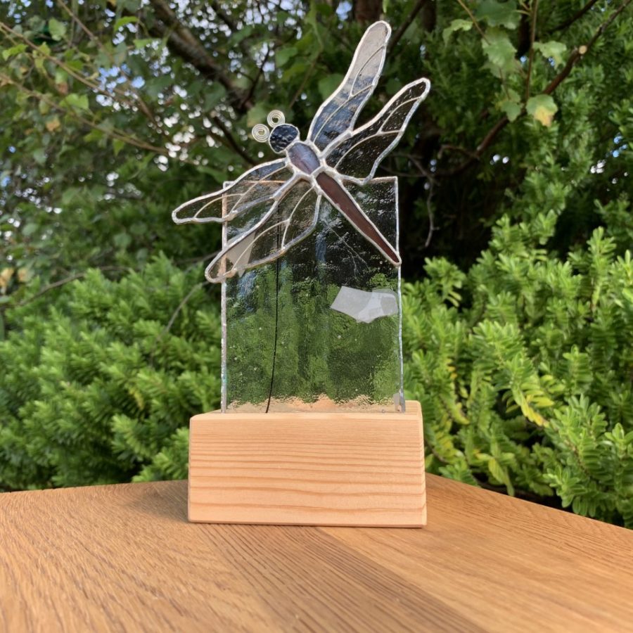 Dragonfly tealight holder. Handmade with stained glass (state what colour you'd like in the comment box on ordering, subject to availability). Price includes wooden tealight stand and battery operated tealight.