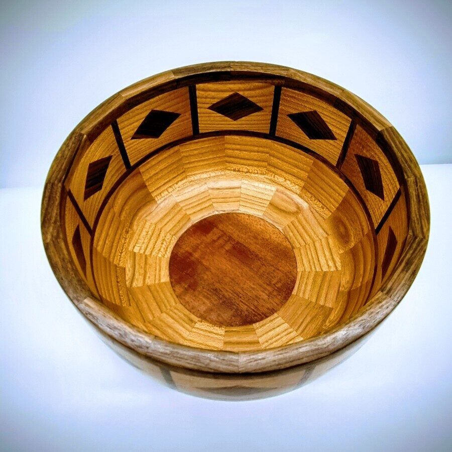 An elm and black walnut bowl with diamond feature finished with Danish oil and then waxed and polished for an deep long lasting shine.