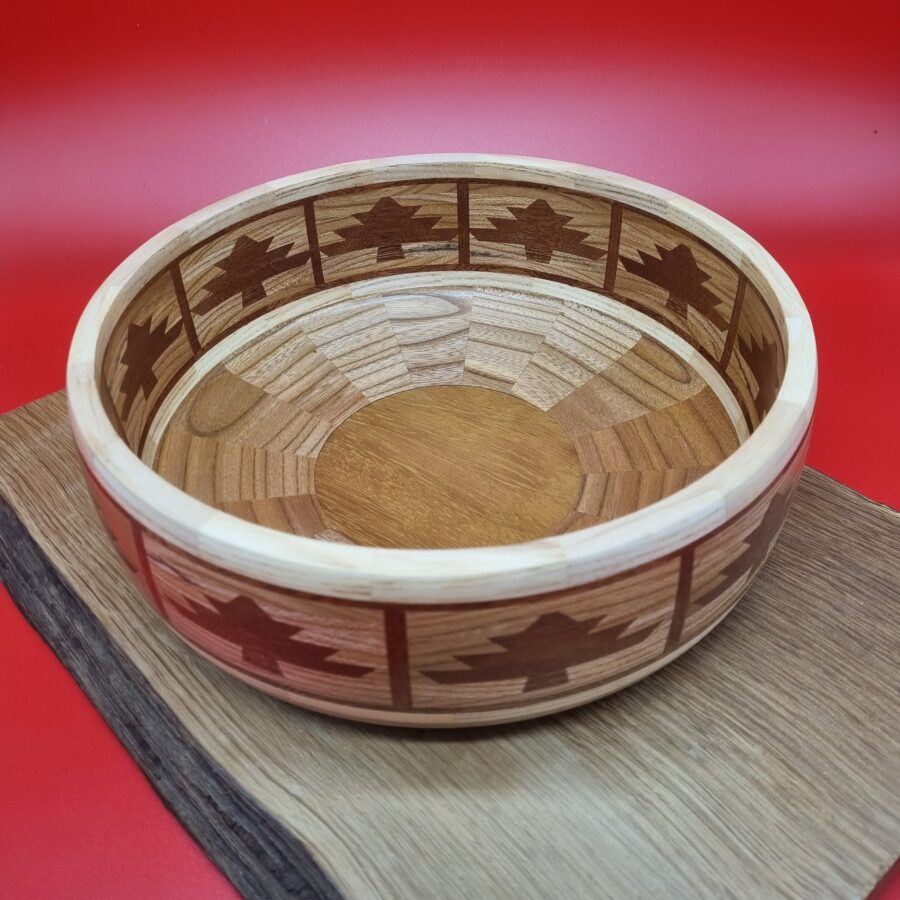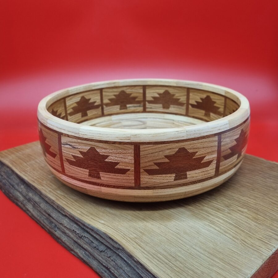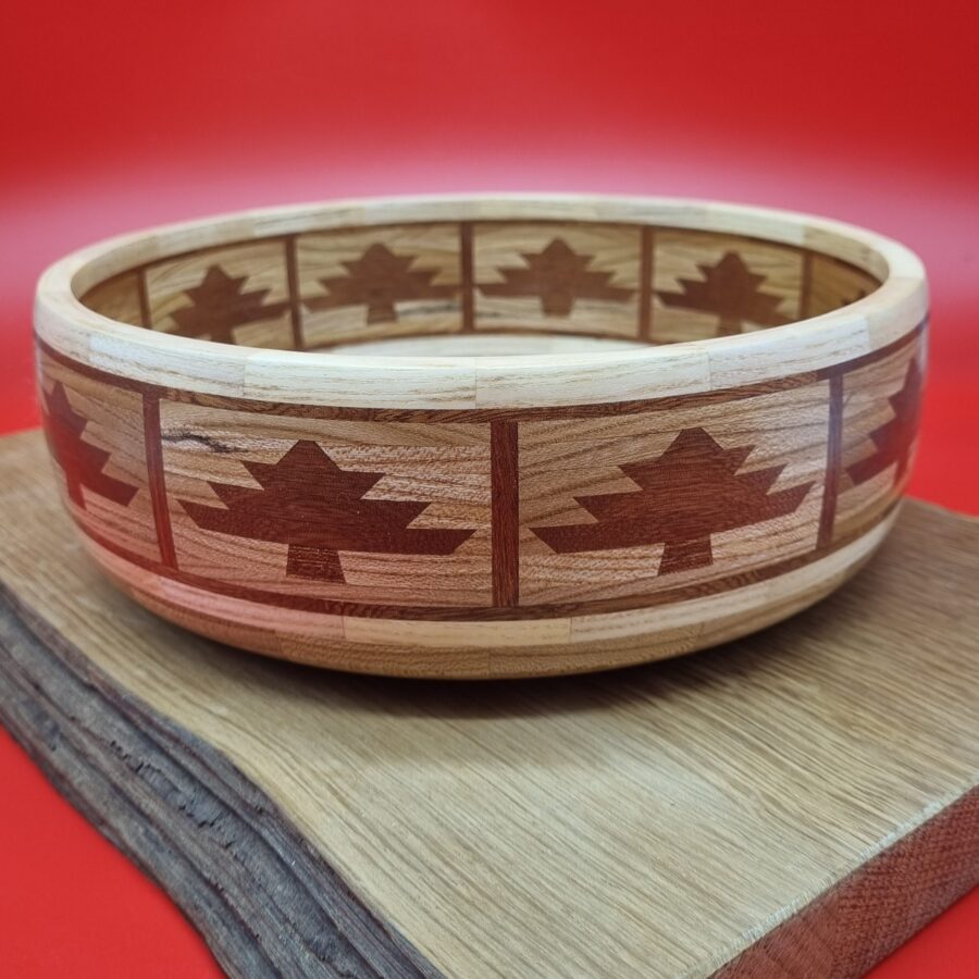 A beautiful elm bowl with mahogany tree features, an ash rim and iroko wood base finished with Danish oil and then waxed for a shine and protection.