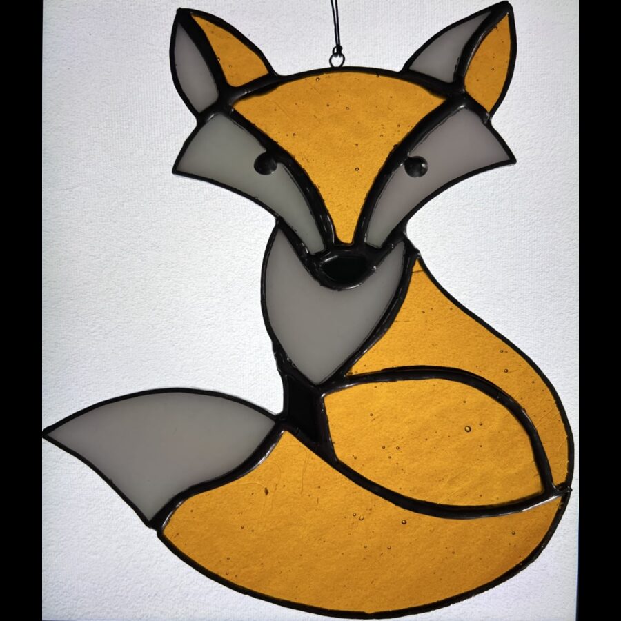 A beautiful fox suncatcher. Handmade with stained glass. Suitable for window or tree hanging and supplied with a clear suction window hook.