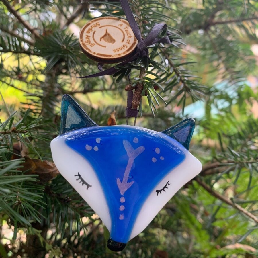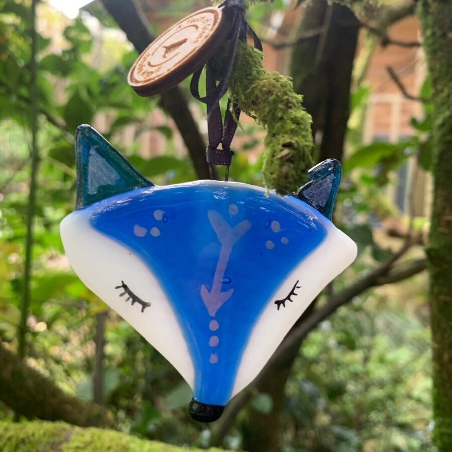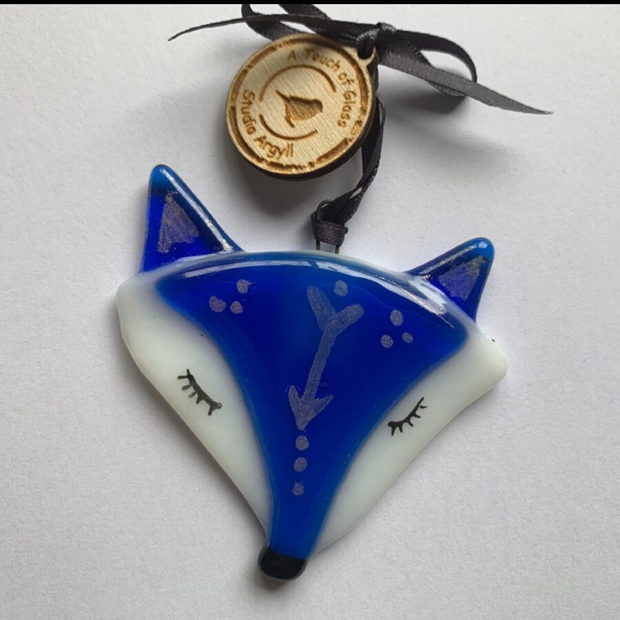A sweet little fused glass bohemian style blue fox, with gold detail. It is made with hand cut and decorated pieces of glass that have been kiln fired.