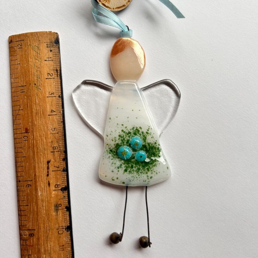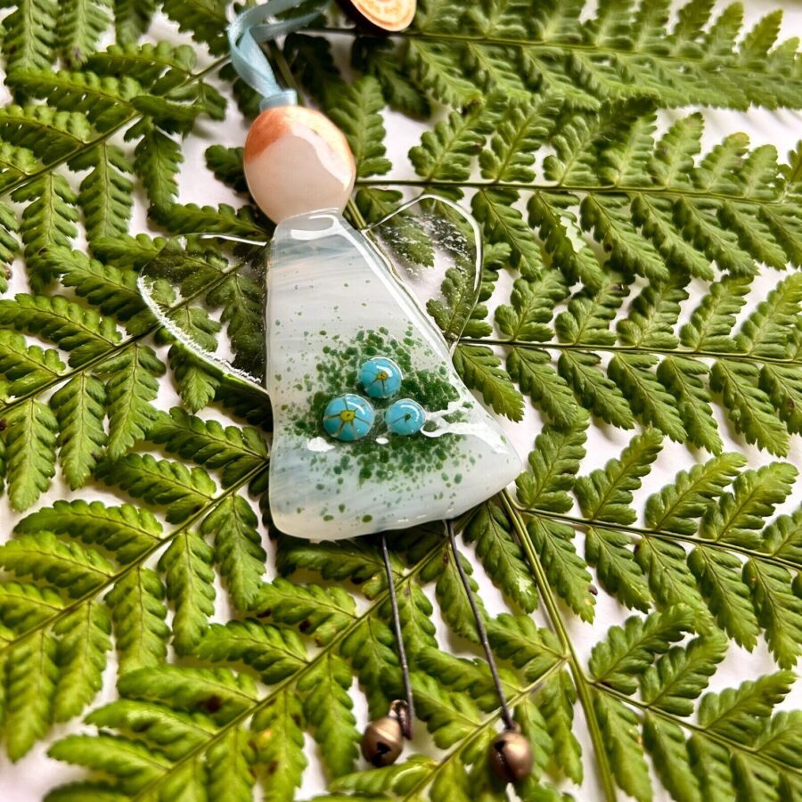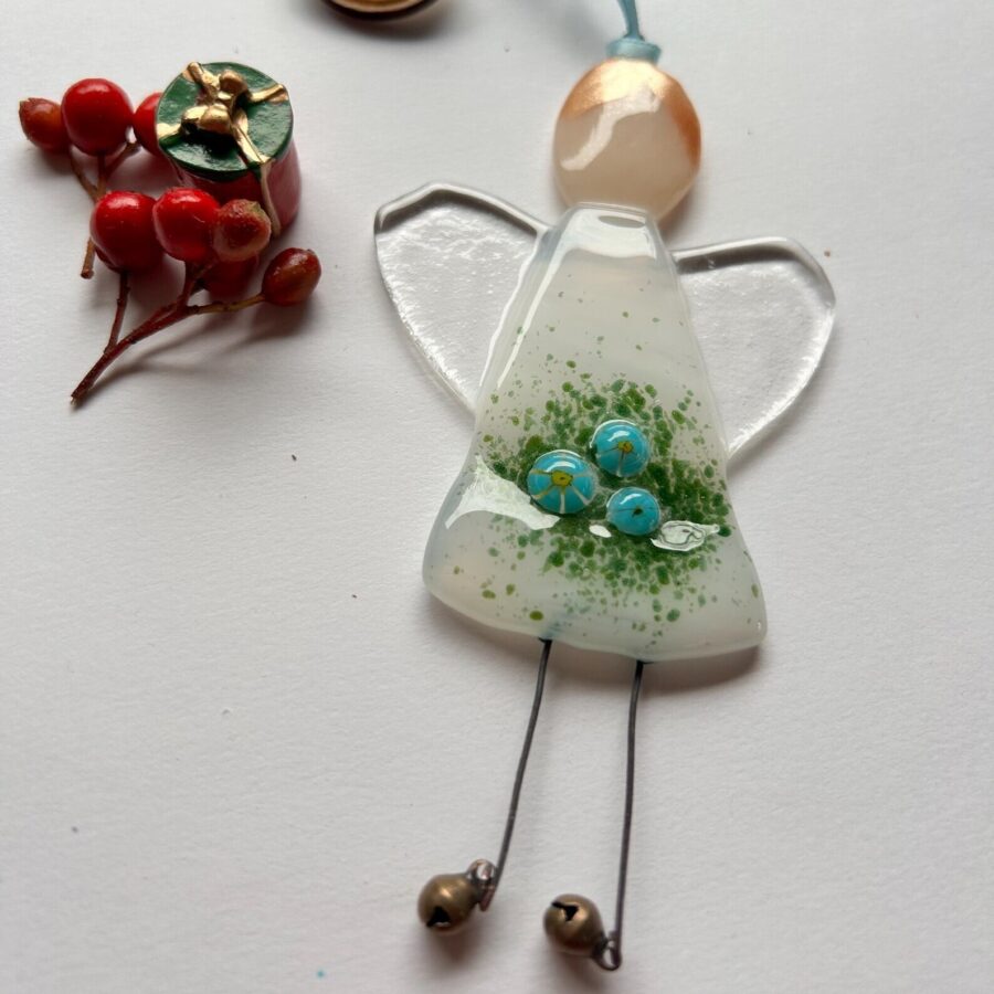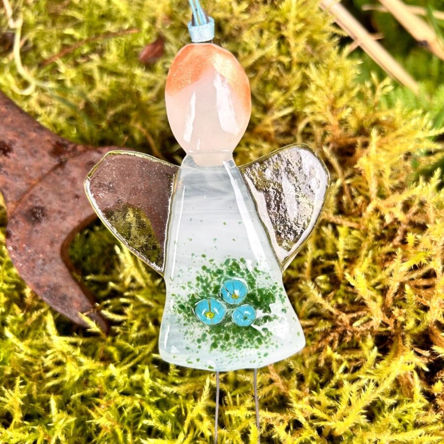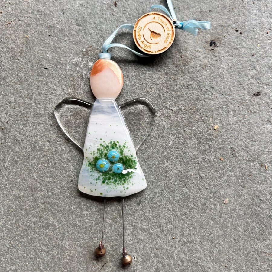 A beautiful fused glass angel Christmas decoration made featuring little forget me not flowers, to represent the makers local argyll Community choir. A Community singing group specifically for people living with dementia and their carers.