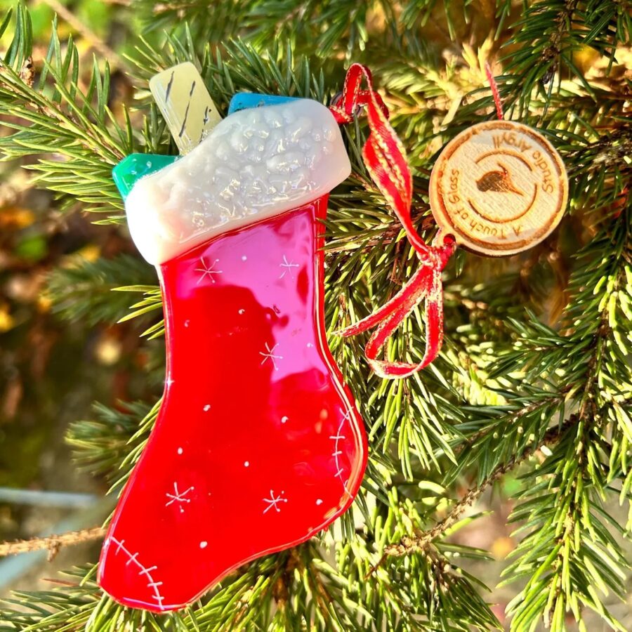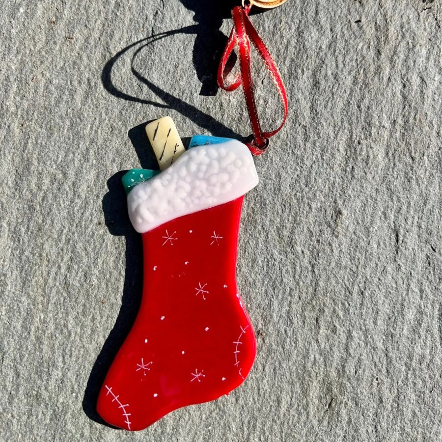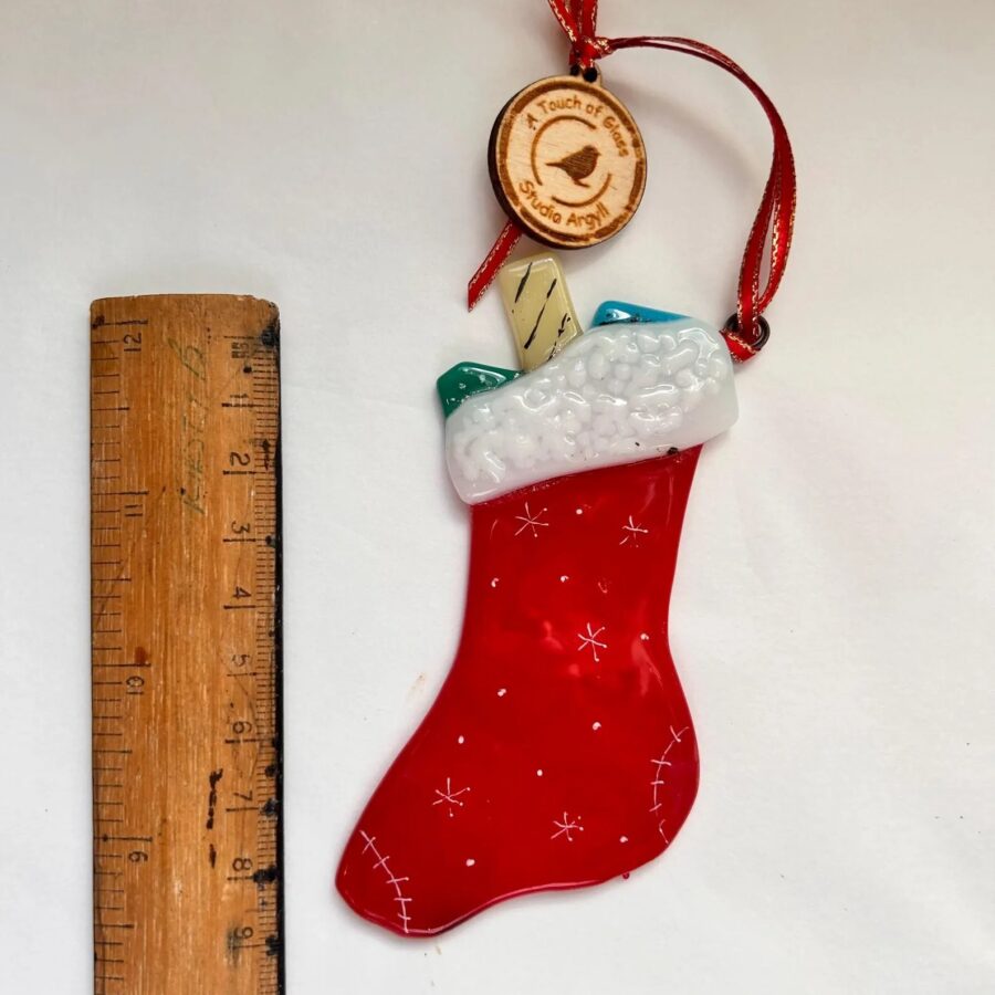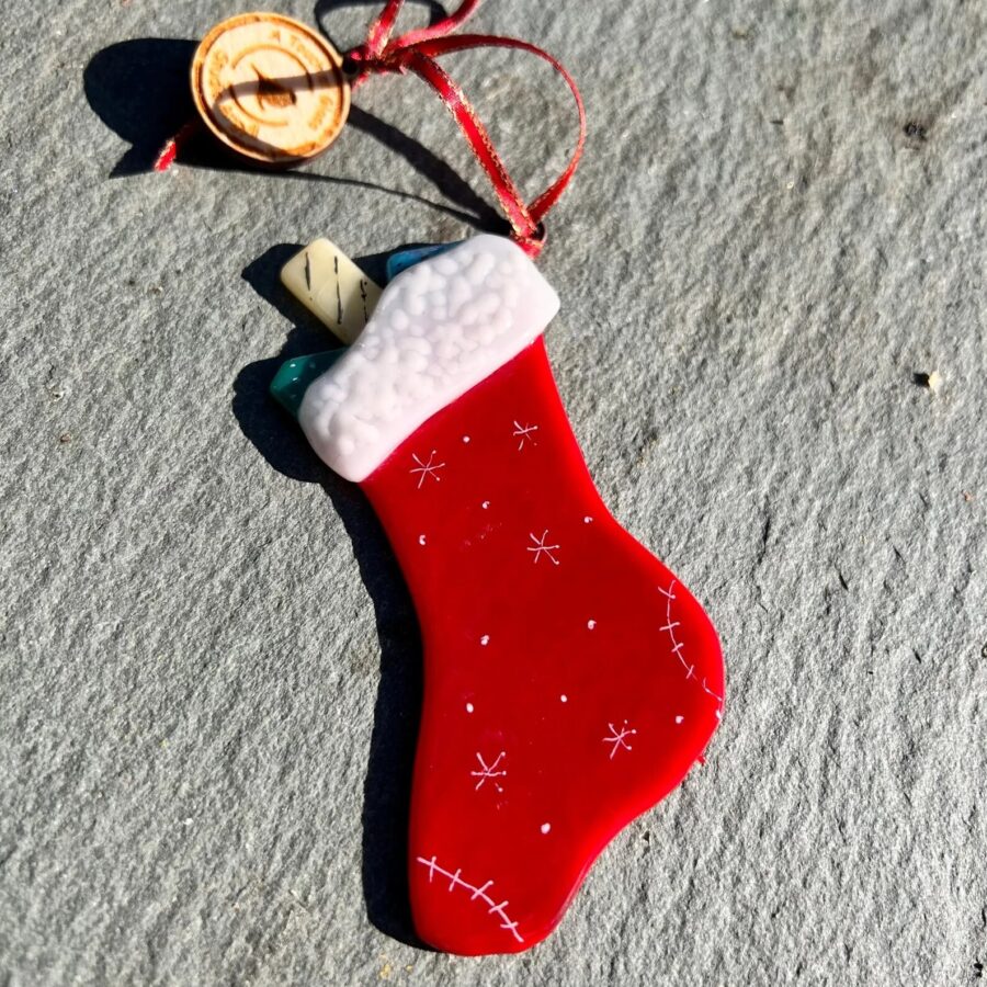 A traditional fused glass Christmas stocking filled with presents, and with hand painted detail.