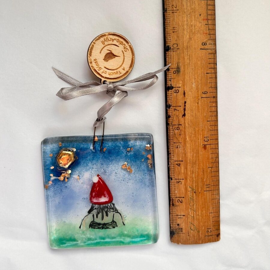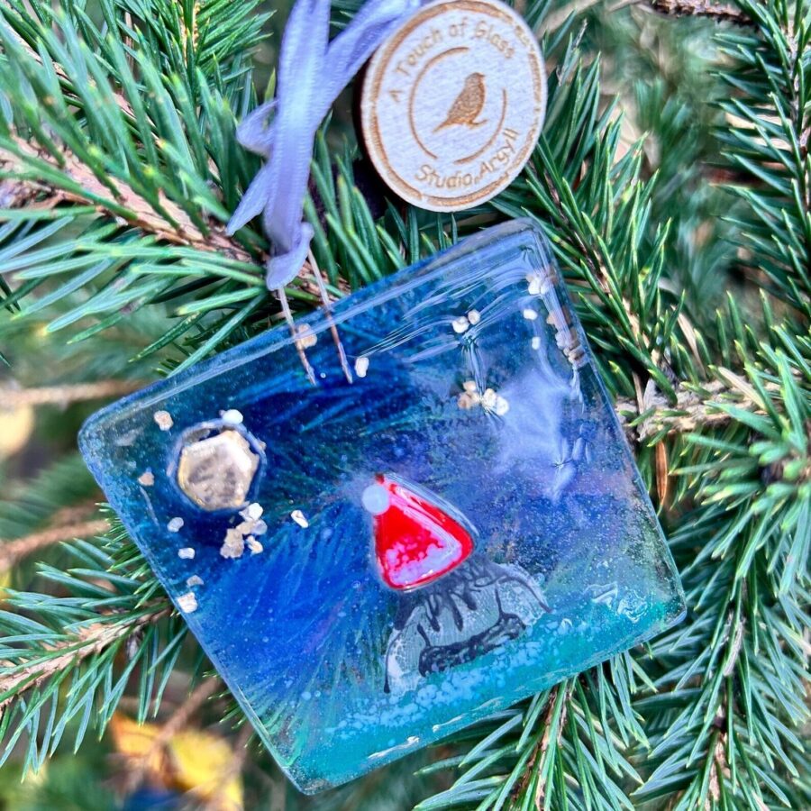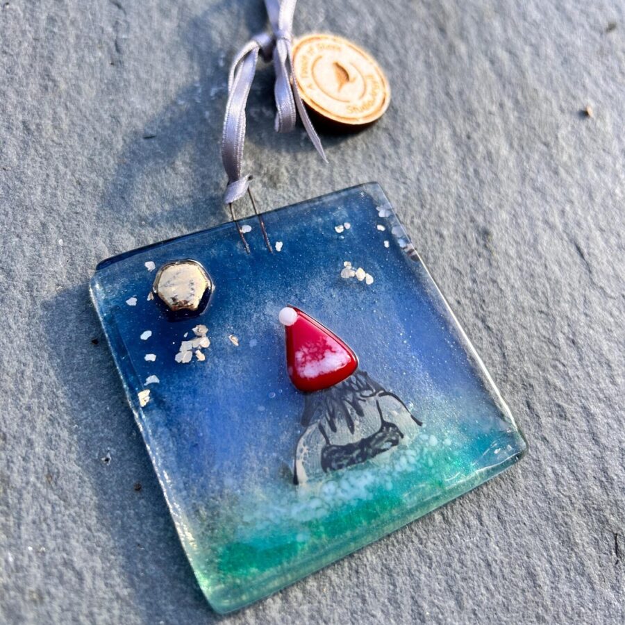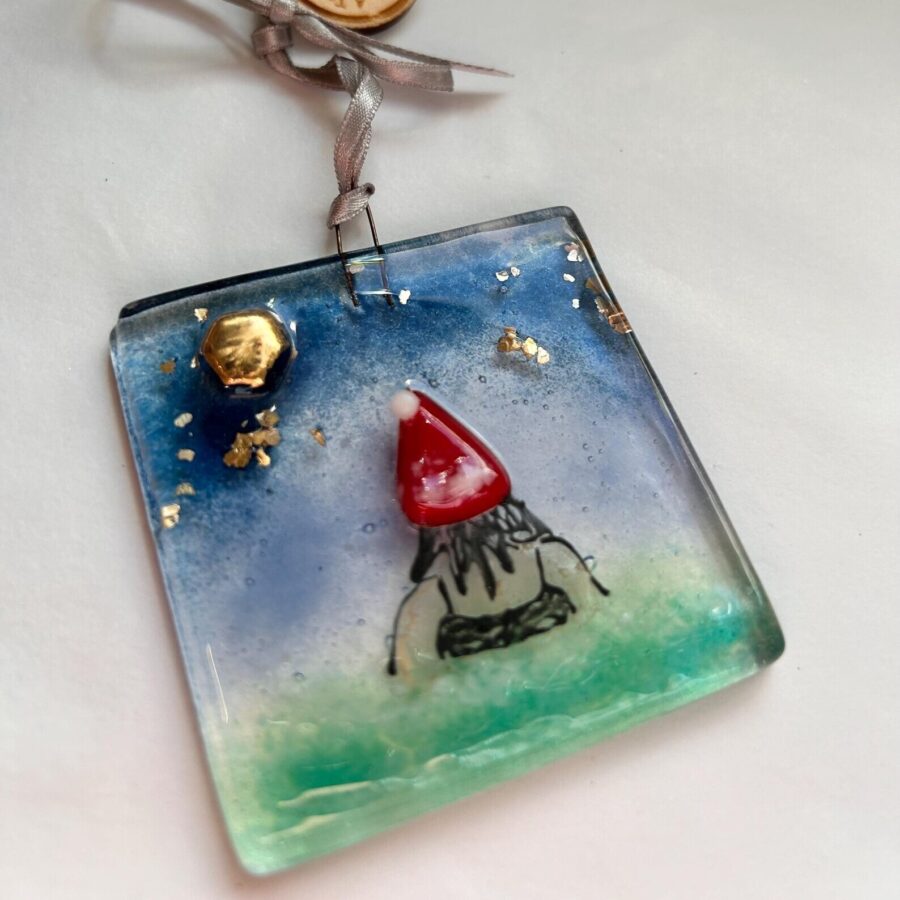 A little festive wild swimmer complete with santa hat. Made from fused glass, with hand painted detail, gold lustre moon and shimmering evening stars.