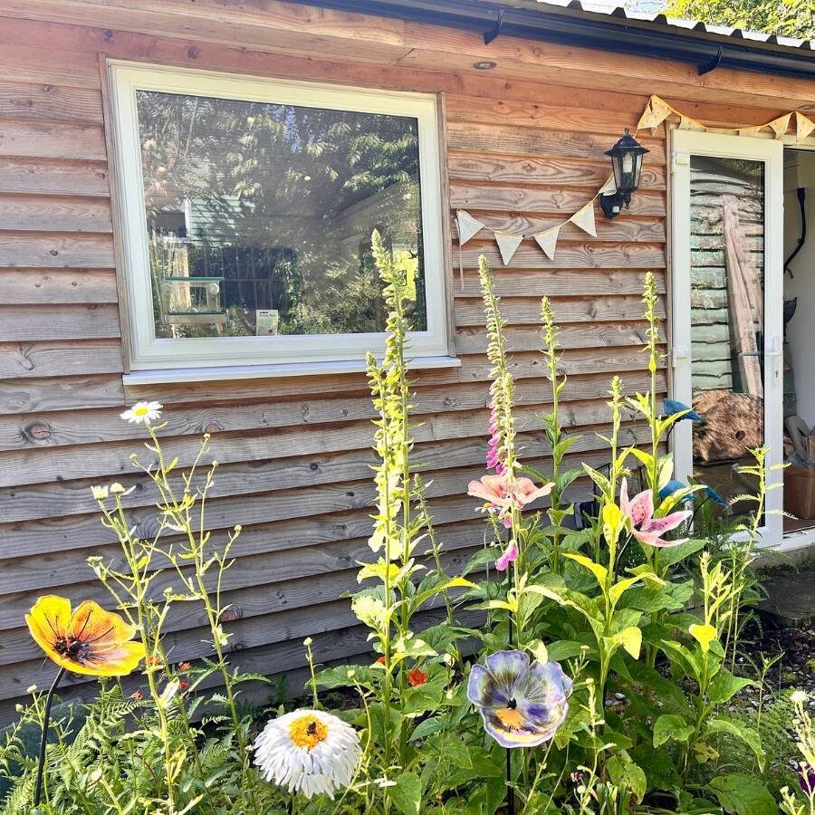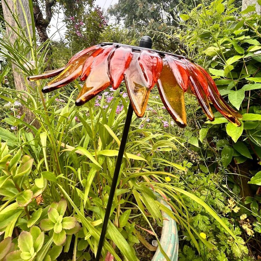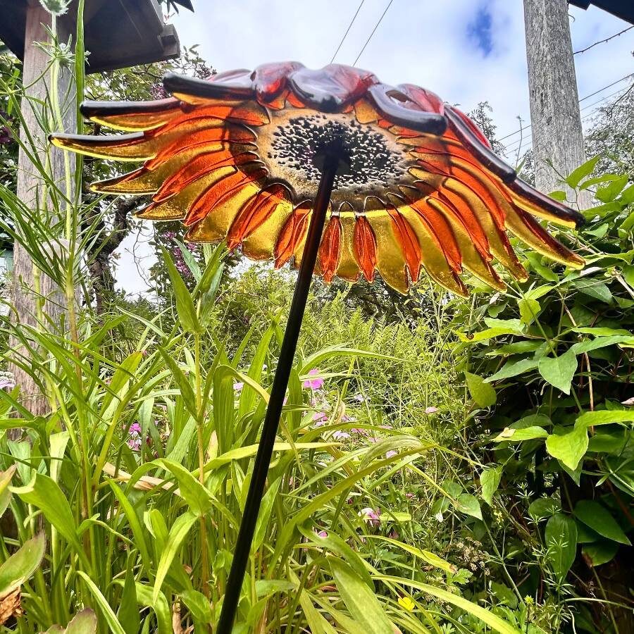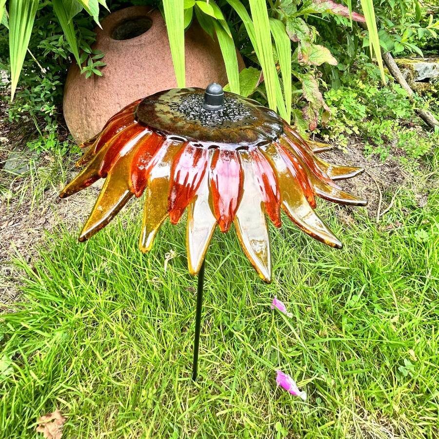 A beautiful fused and slumped glass garden stake, carefully assembled to produce this beautiful golden orange sunflower. Attached to a powder coated steel rod. Suitable for use in the garden all year round, in a sheltered spot from the wind.