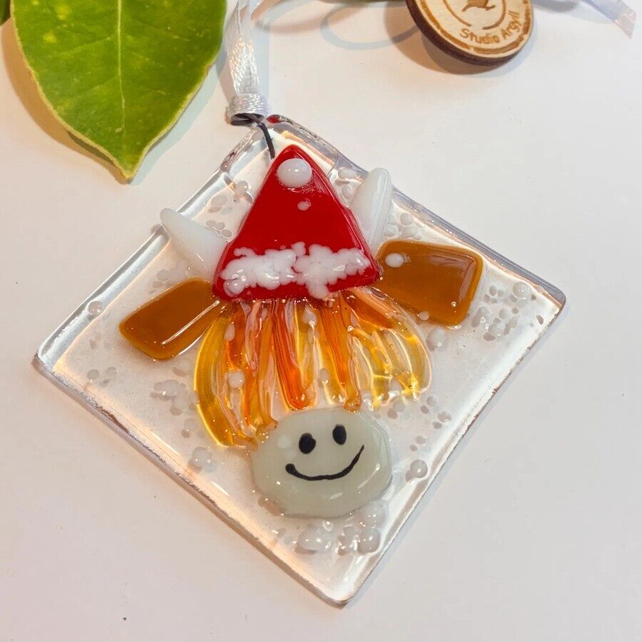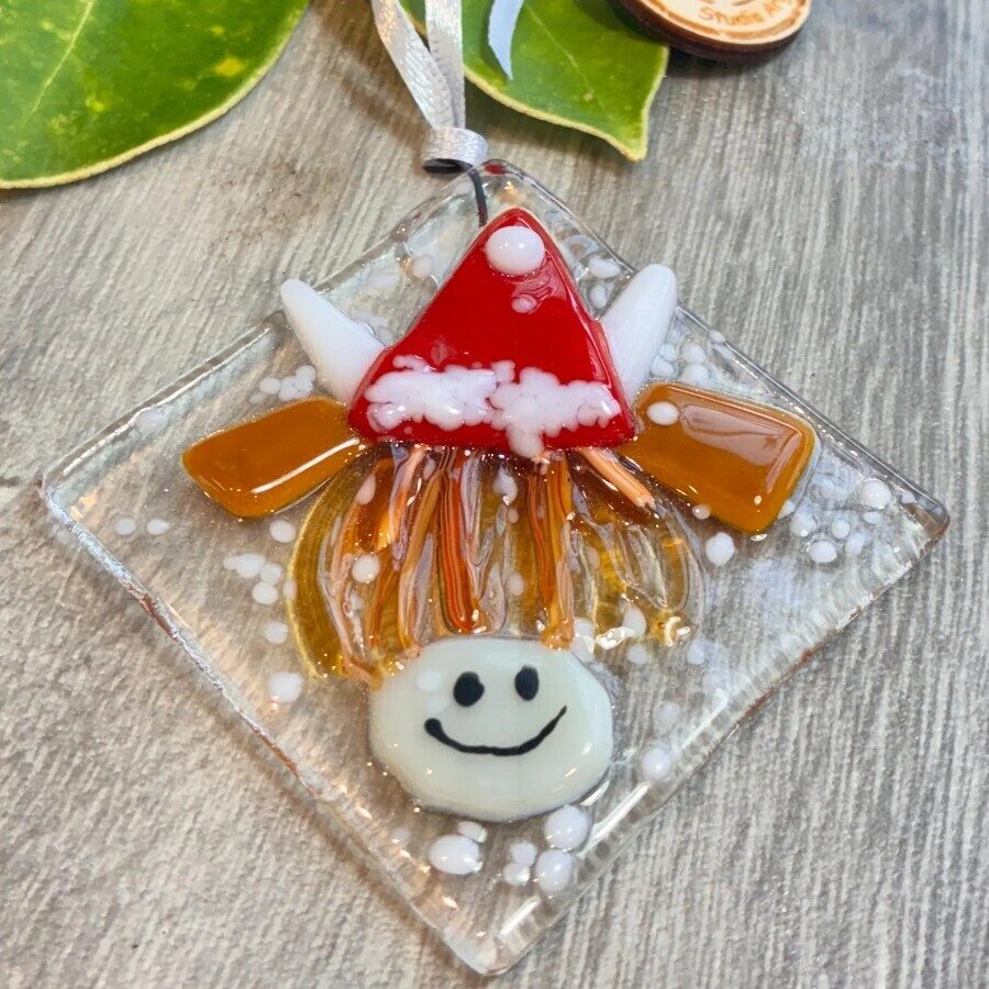 A fantastic handmade fused glass tree decoration, with painted detail of a fun and friendly Santa Highland Cow, with his multi tone shaggy coat and iconic horns.