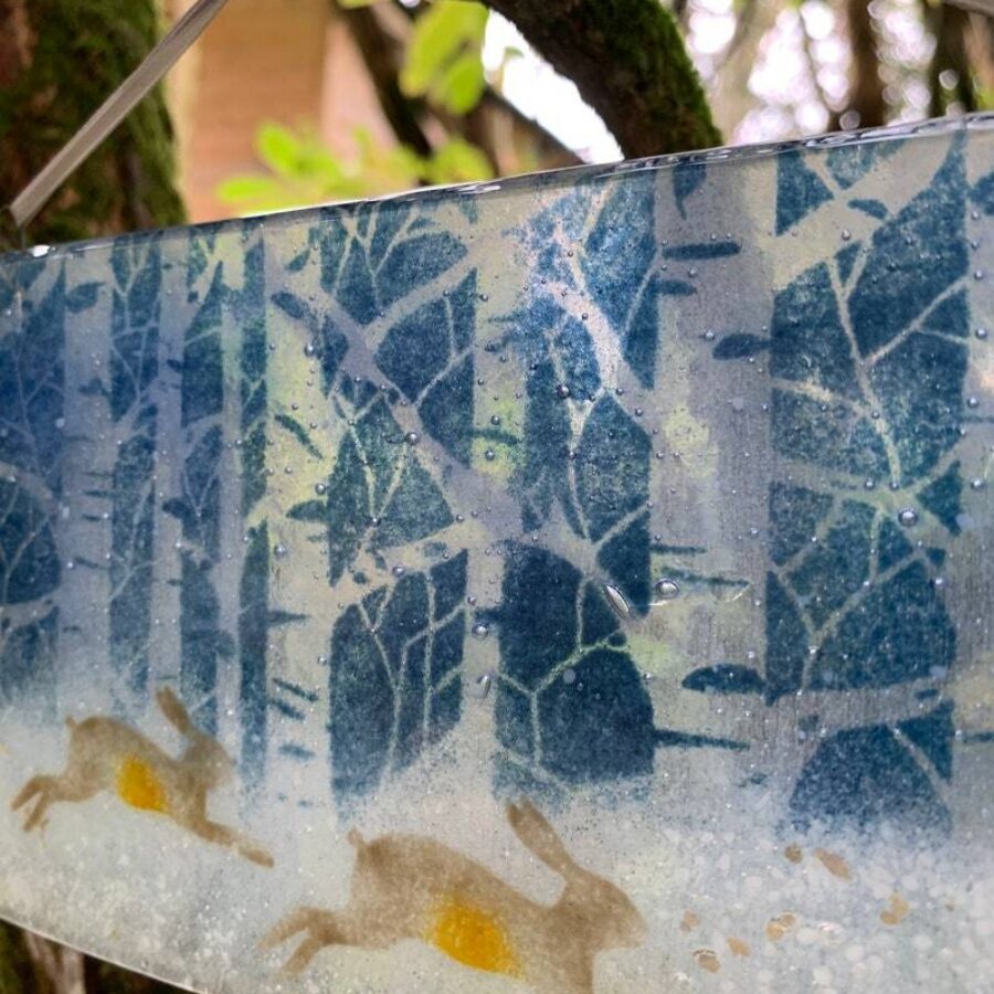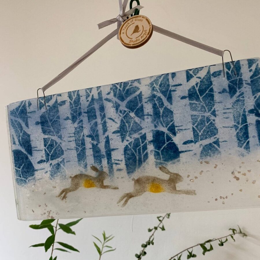 A beautiful fused glass hanger of winter hares in the snow, with silver birch tree background.