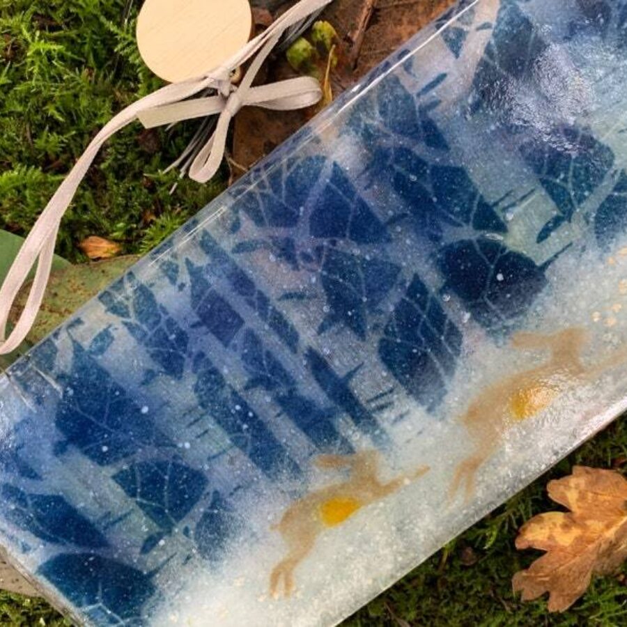 This kiln formed and hand painted glass plaque with meadow hares is a lovely gentle piece of nature captured in glass.