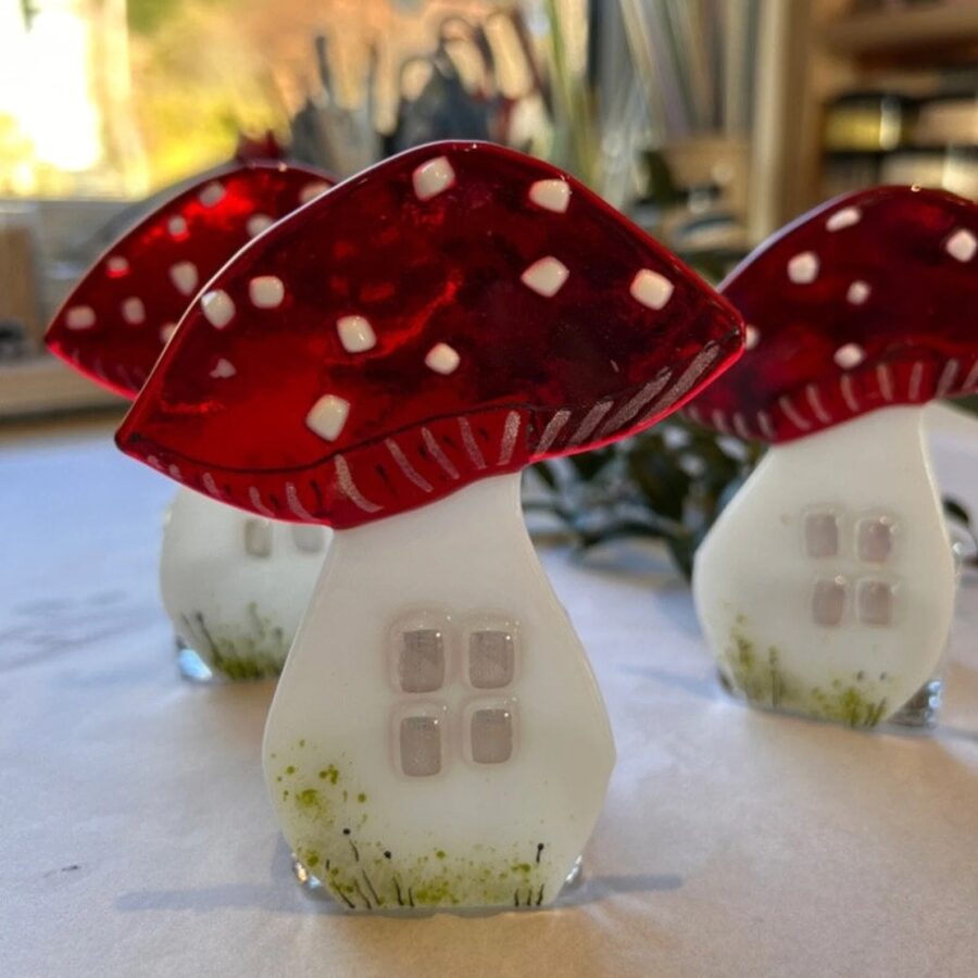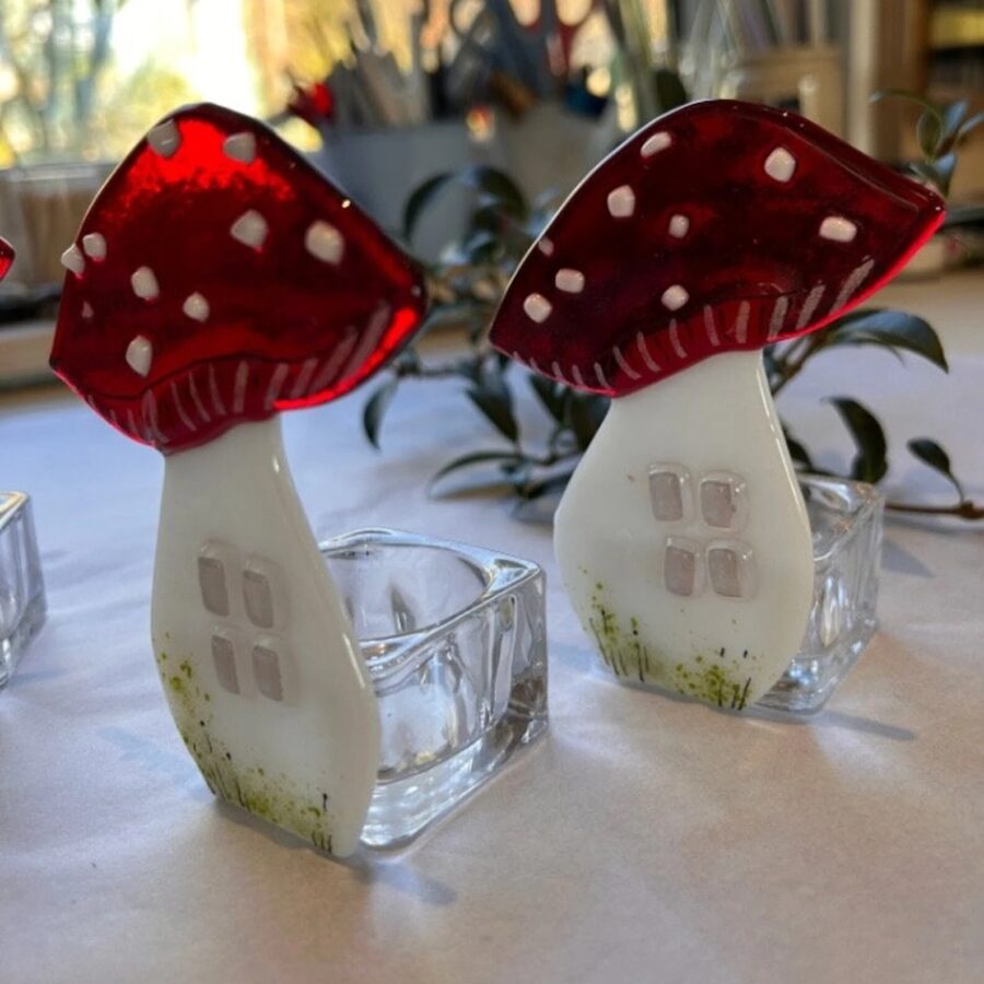A sweet handmade fused glass mushroom candle holder. Each may vary slightly from the images due to their handmade nature.
