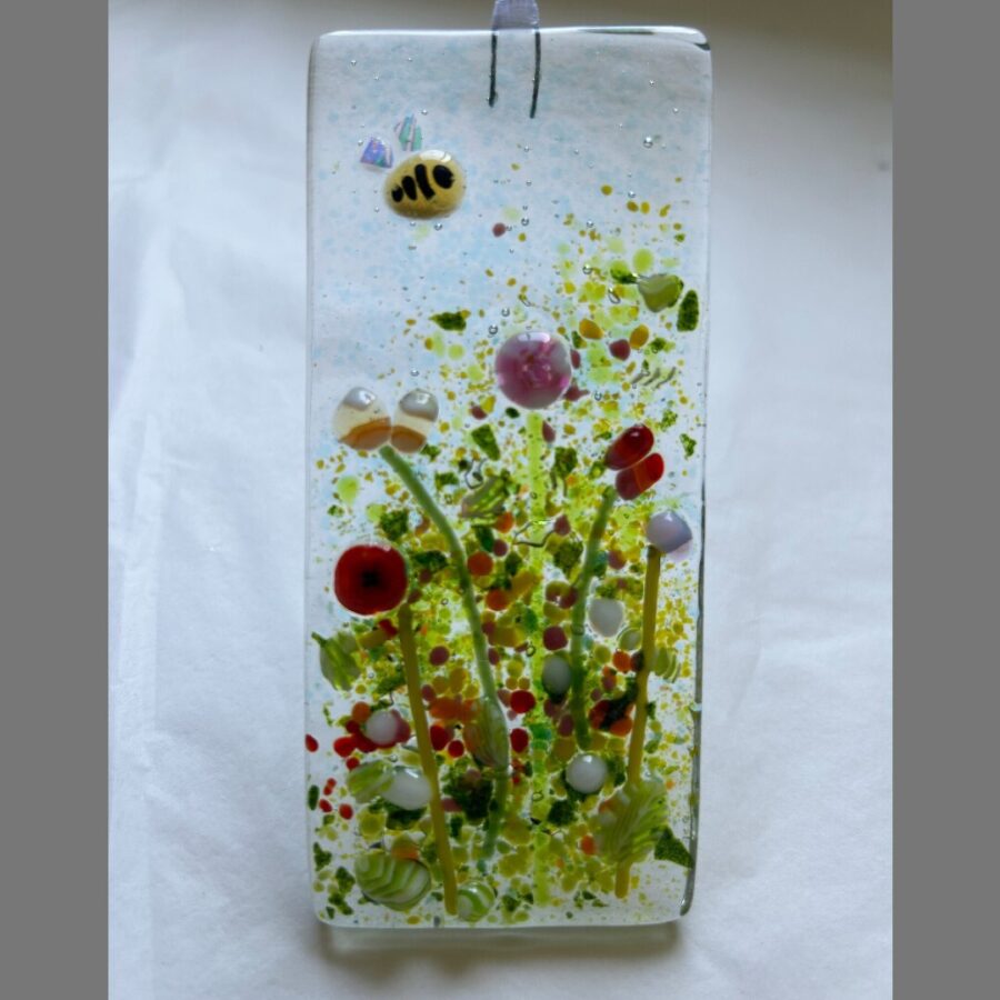 A delightful fused glass decoration featuring a bee among wild flowers. It is made with hand cut and decorated pieces of glass that have been kiln fired.