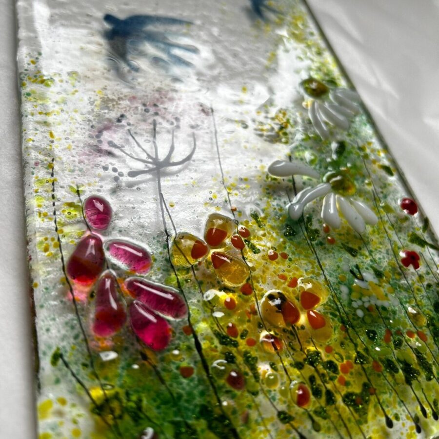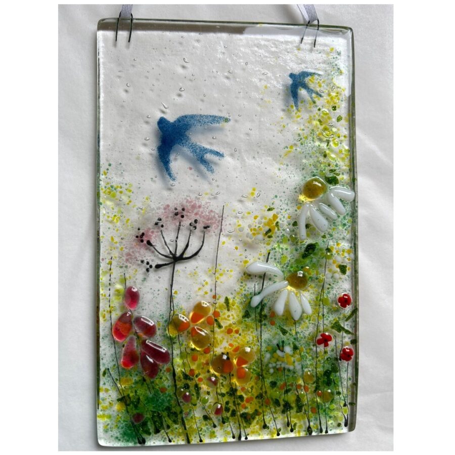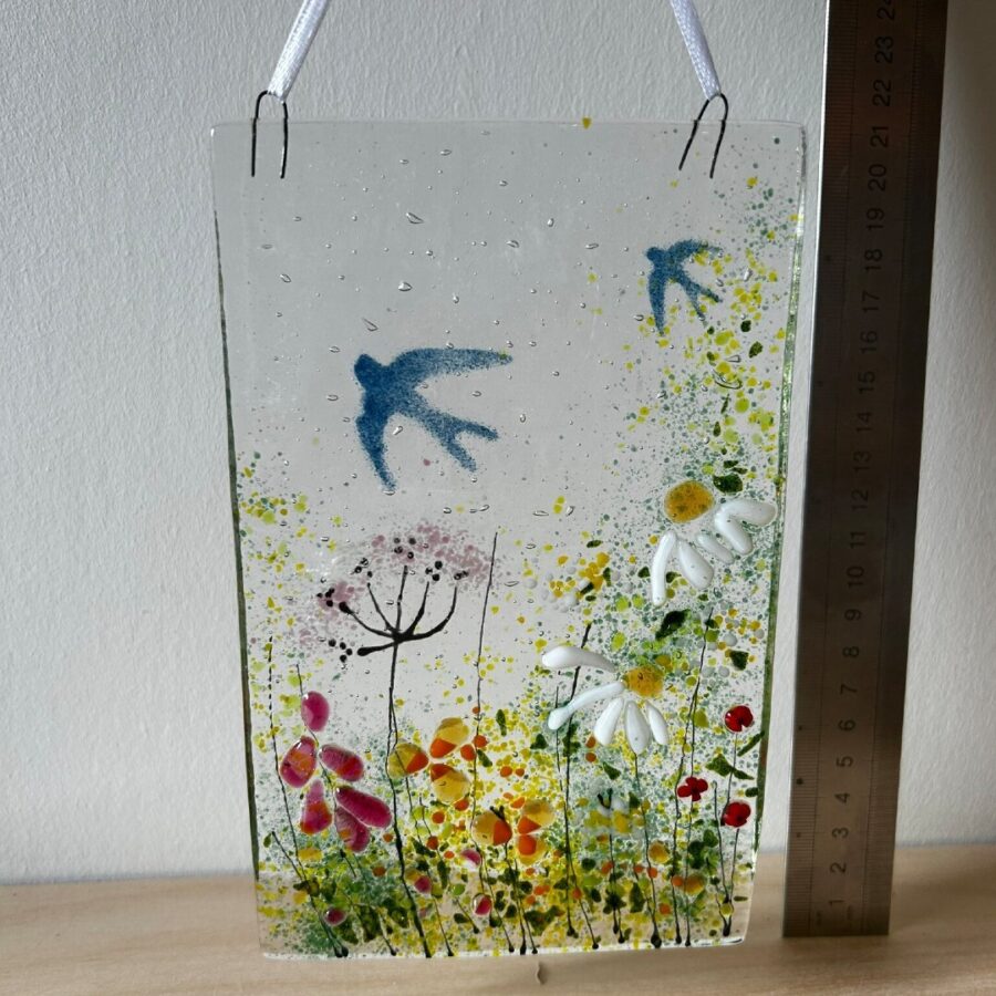 This gorgeous fused glass decoration features a beautiful summer meadow with swooping swallows. It is made with hand cut and decorated pieces of glass that have been kiln fired.