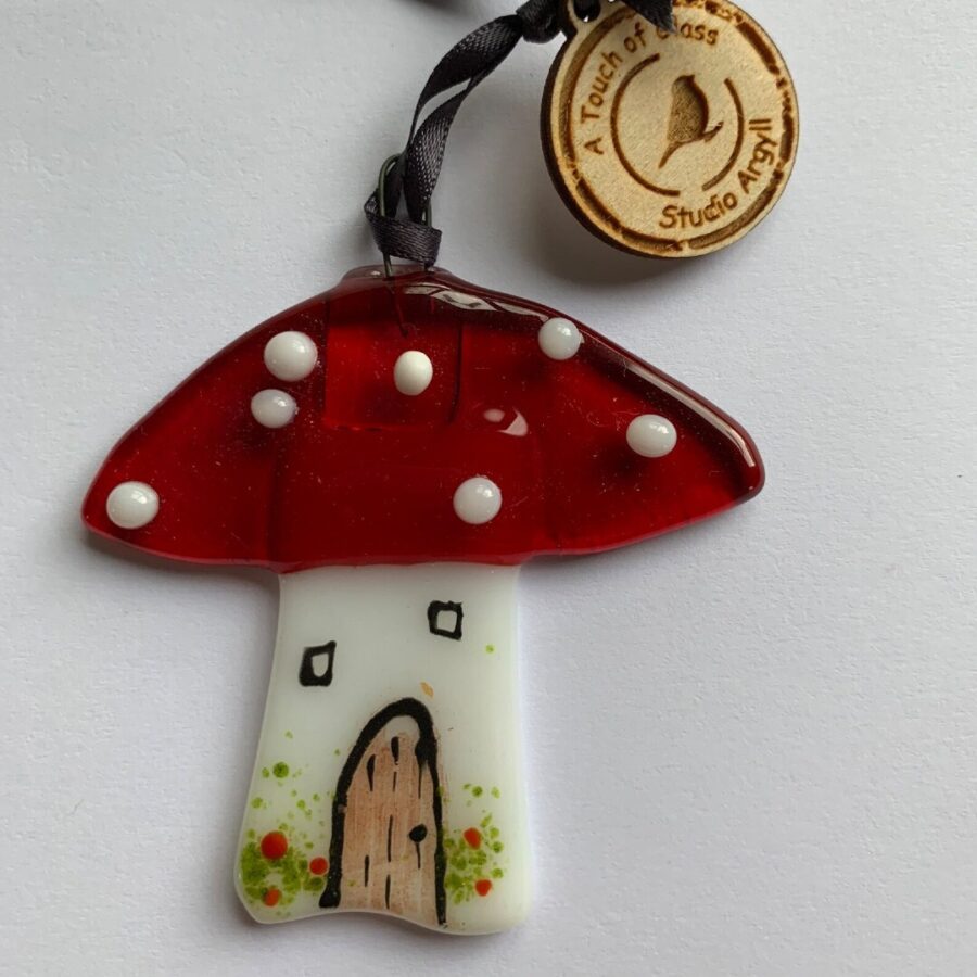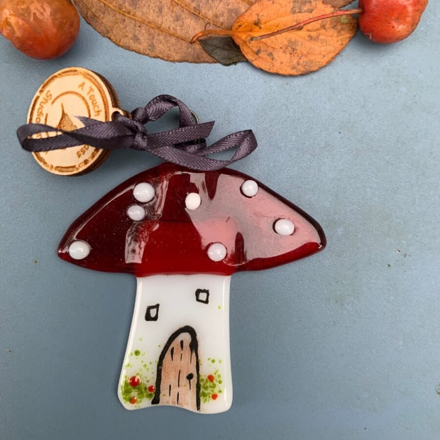 A fun little fairy house mushroom tree decoration. It is made with hand cut and decorated pieces of glass.