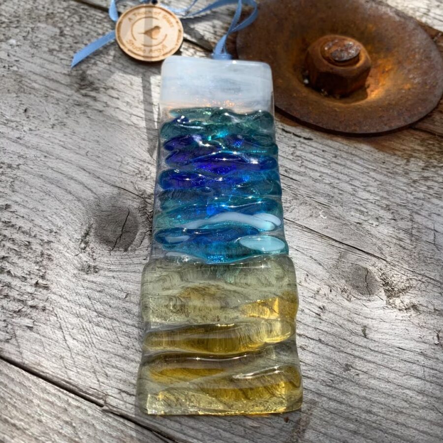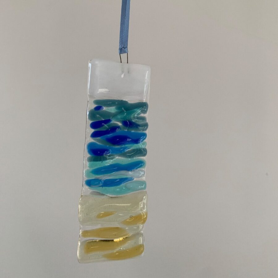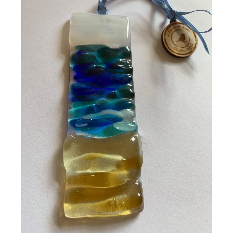 An abstract fused glass suncatcher featuring a shoreline and ocean waves. It is made with hand cut and decorated pieces of glass that have been kiln fired.