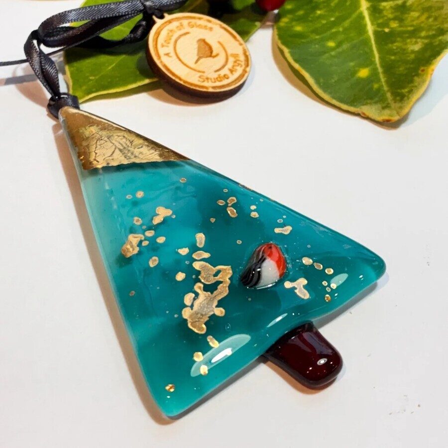 A sweet Christmas tree decoration in a striking peacock blue and whispy white. Hand painted and kiln fired liquid gold detailing and a little robin.