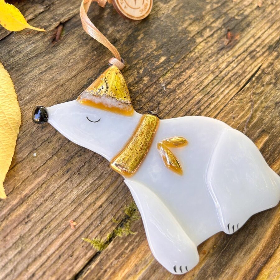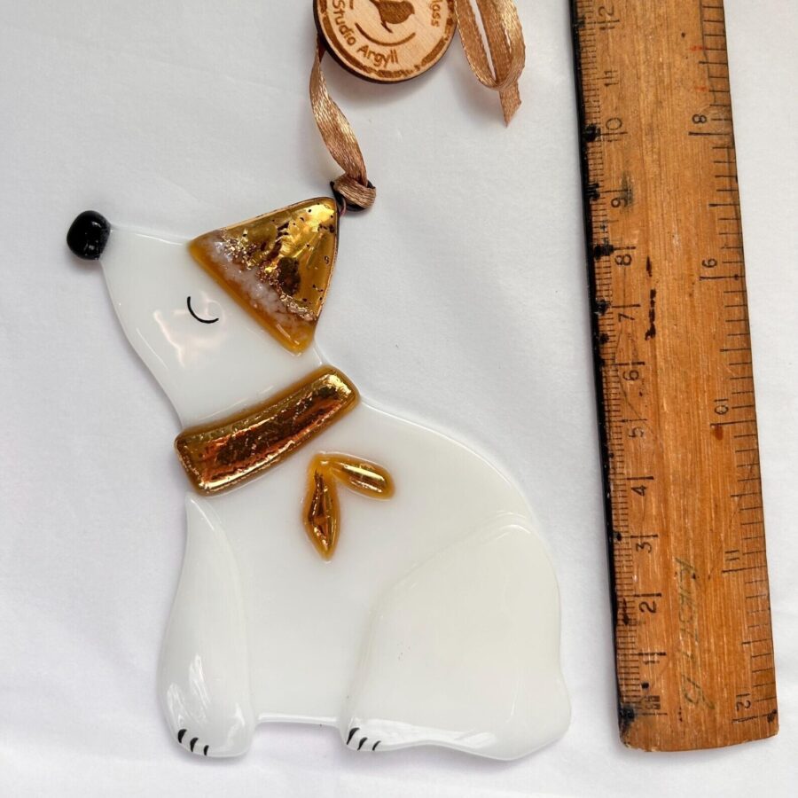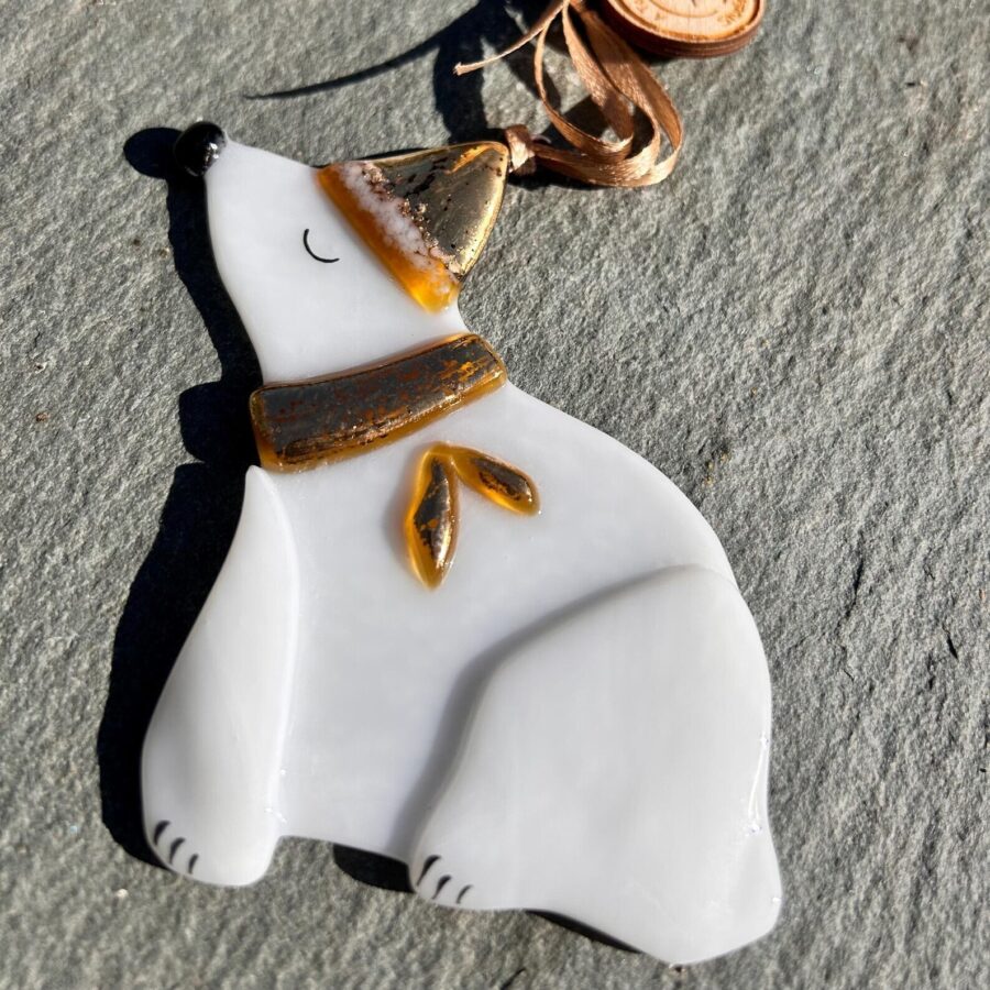 An adorable fused glass Christmas polar bear decoration, with gold hat and scarf.
