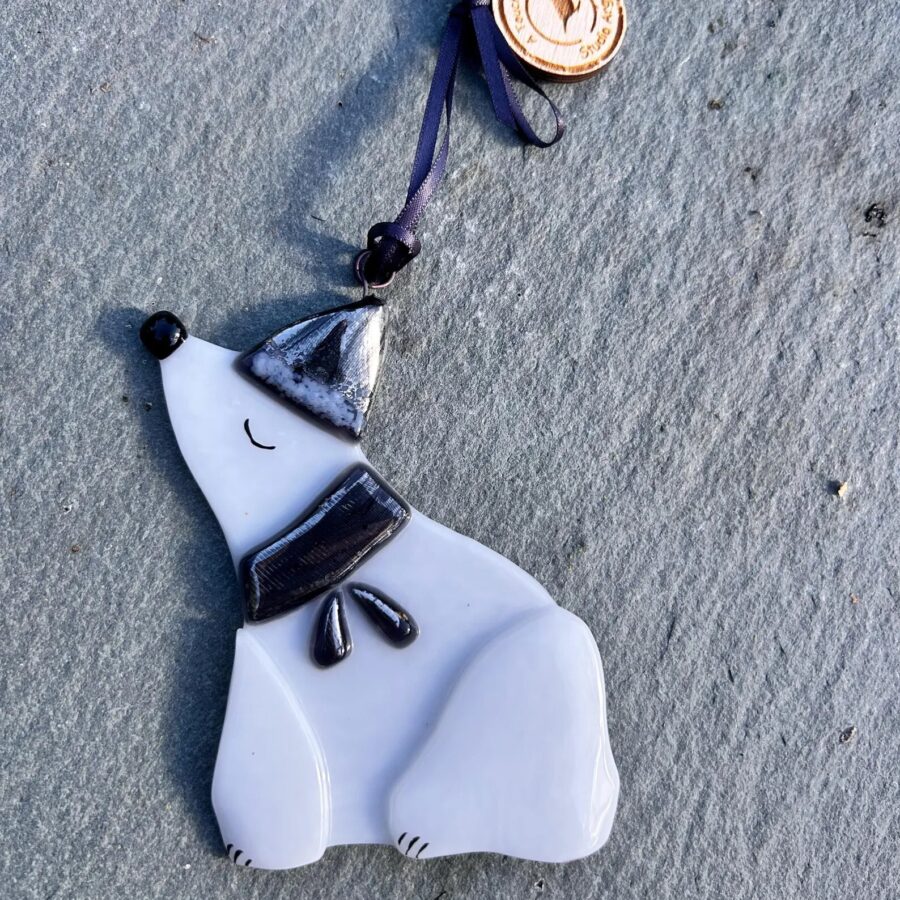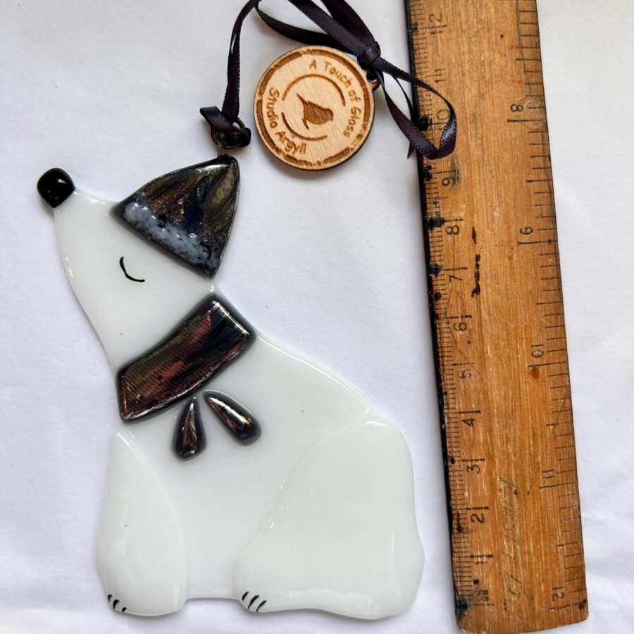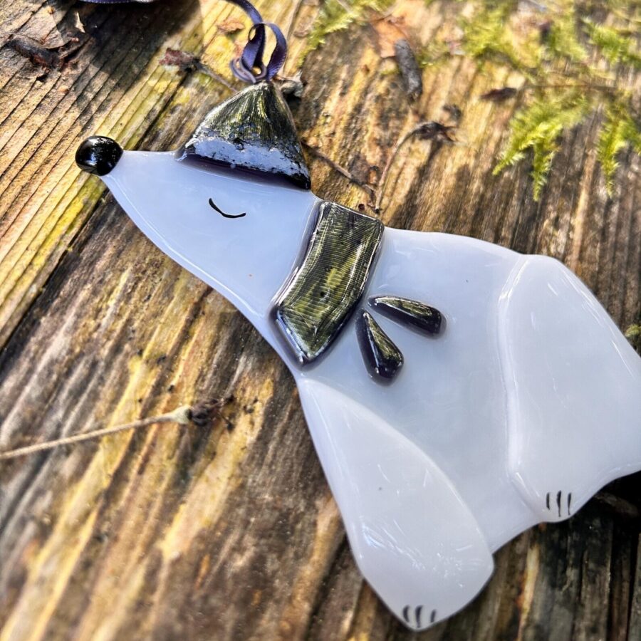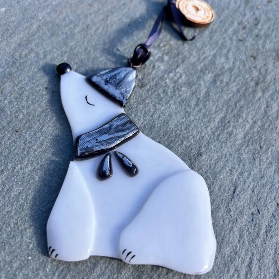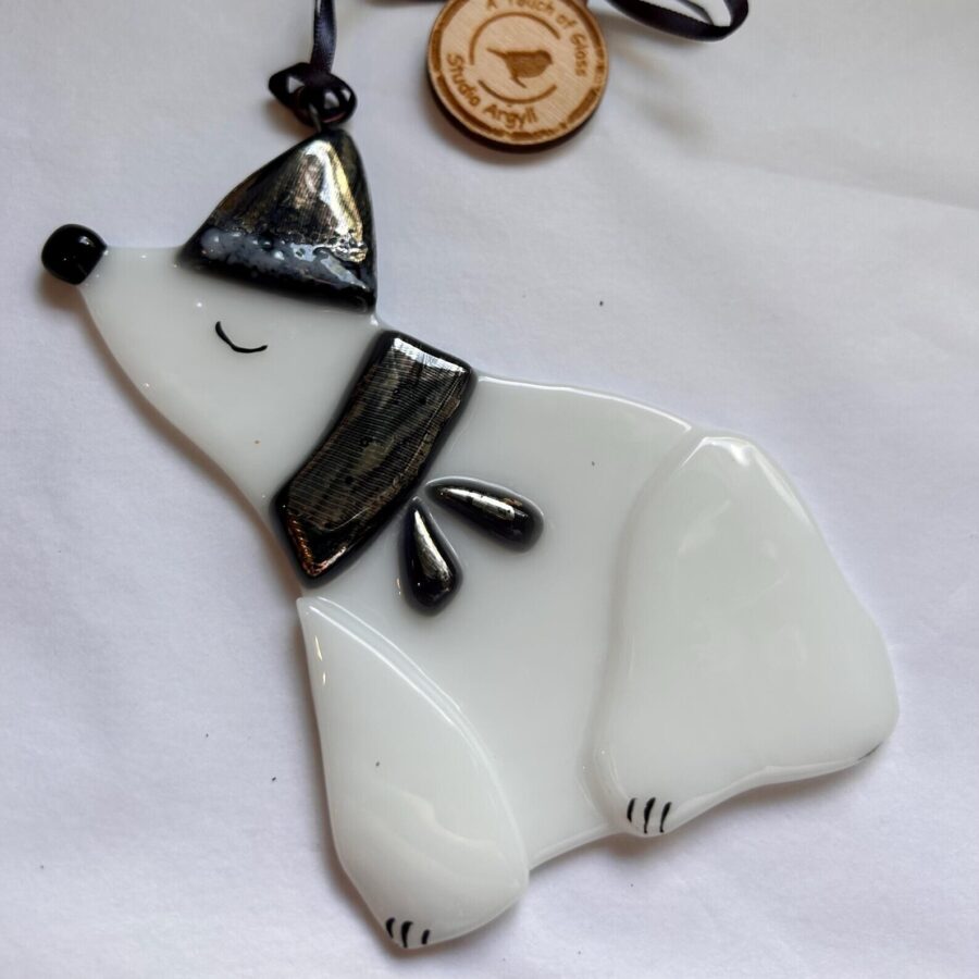 An adorable fused glass Christmas polar bear decoration, with silver hat and scarf.