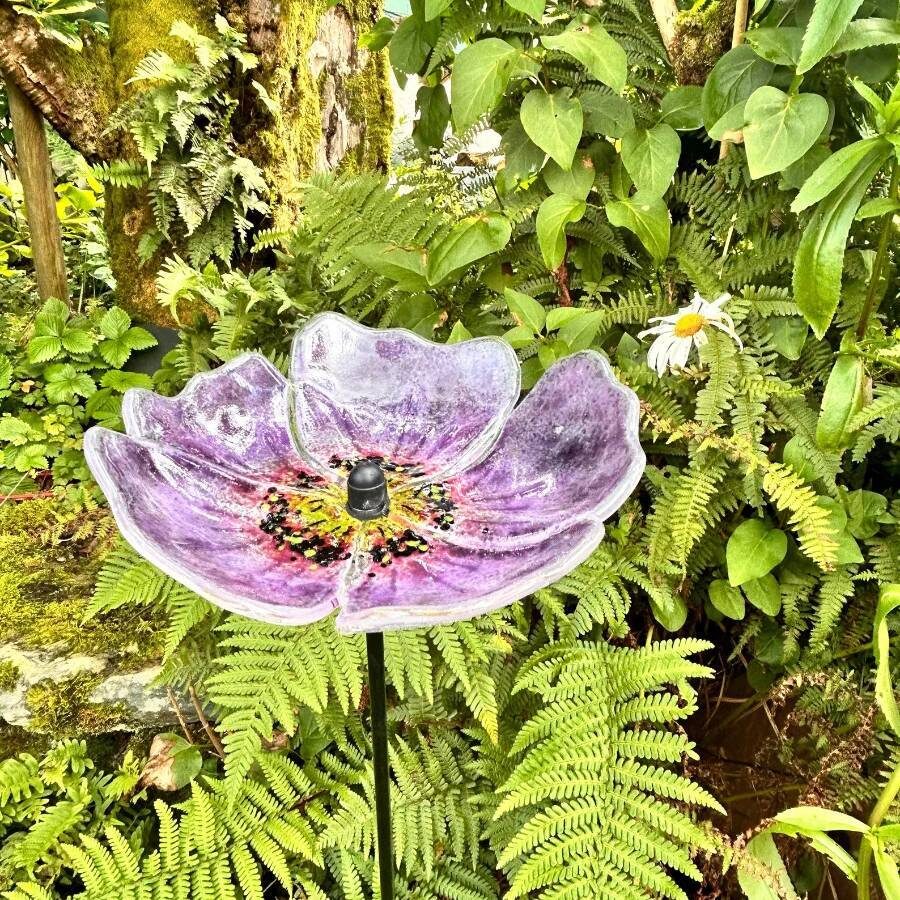 A beautiful fused and slumped glass garden stake, carefully assembled to produce this delicate purple poppy. Attached to a powder coated steel rod. Suitable for use in the garden all year round, in a sheltered spot from the wind.
