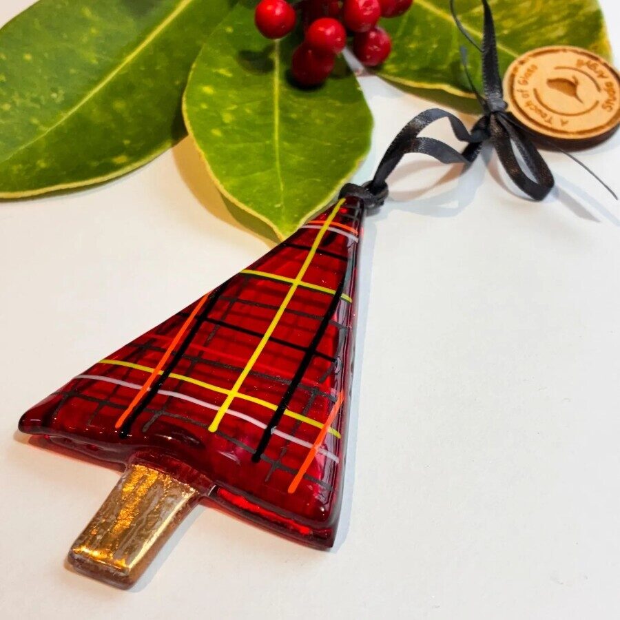 A beautiful handmade fused glass tree decoration of a Scottish red tartan tree. Made with fused glass and hand painted parts carefully assembled and kiln fired.