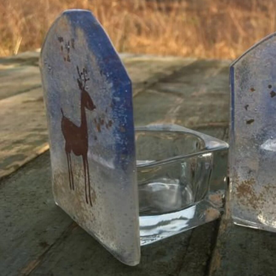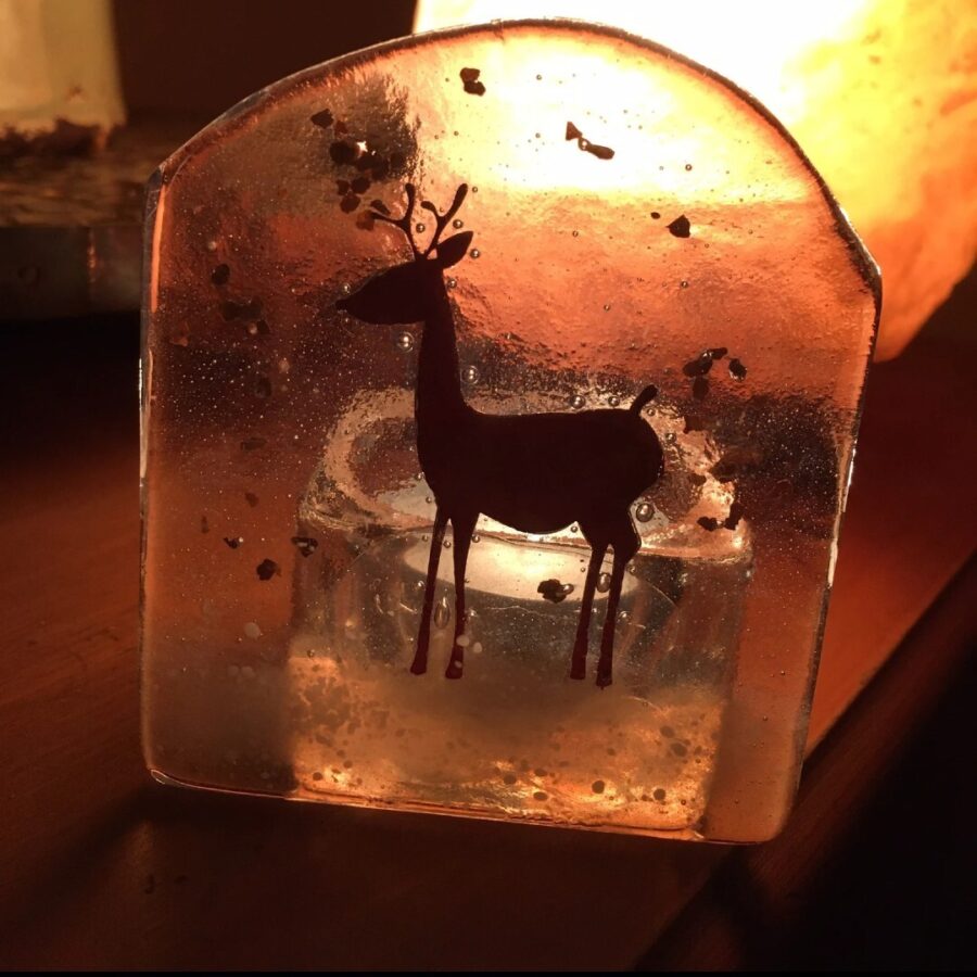 Individually decorated glass pieces filled with a copper deer and encased in glass. Kiln fired and assembled into a glass tea light holder. It looks beautiful lit and equally sweet not.