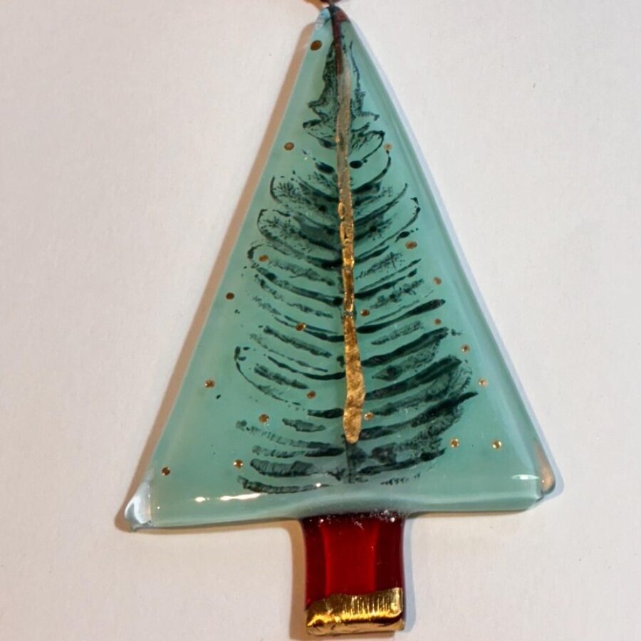 A beautiful handmade fused glass teal tree decoration with a little bit of gold and printed detail made from real fern leaves and kiln fired. Made with fused glass and hand painted parts carefully assembled and kiln fired.