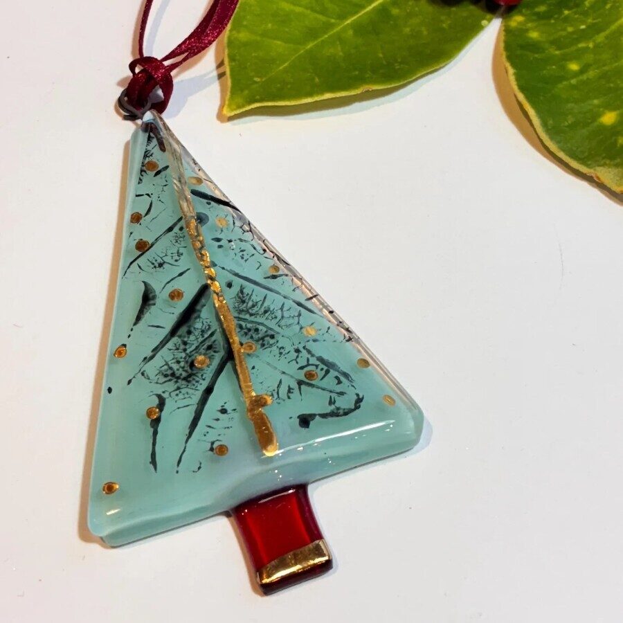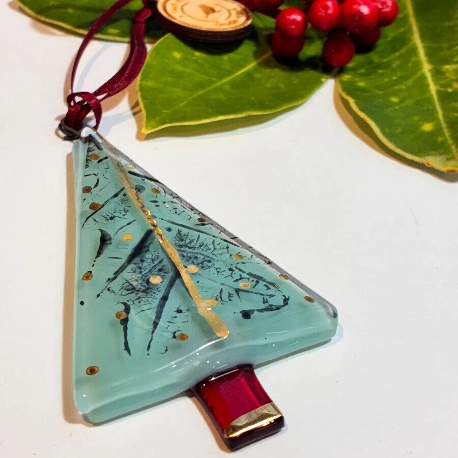 A beautiful handmade fused glass teal tree decoration with a little bit of gold and printed detail made from real oak leaves and kiln fired. Made with fused glass and hand painted parts carefully assembled and kiln fired.