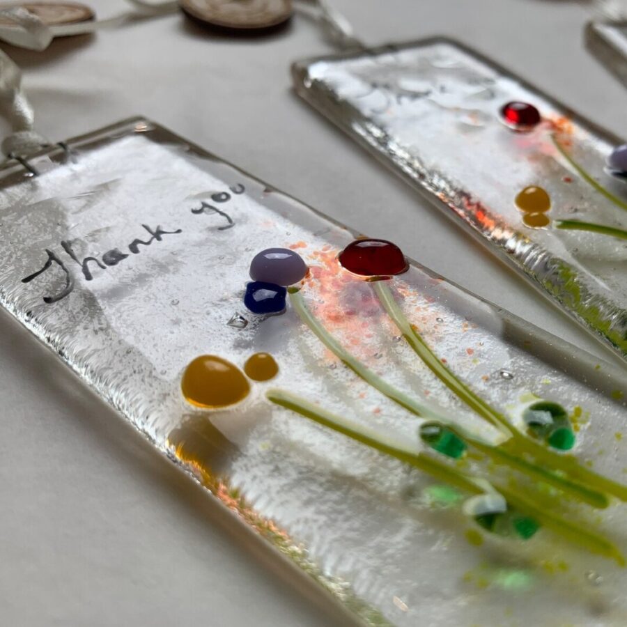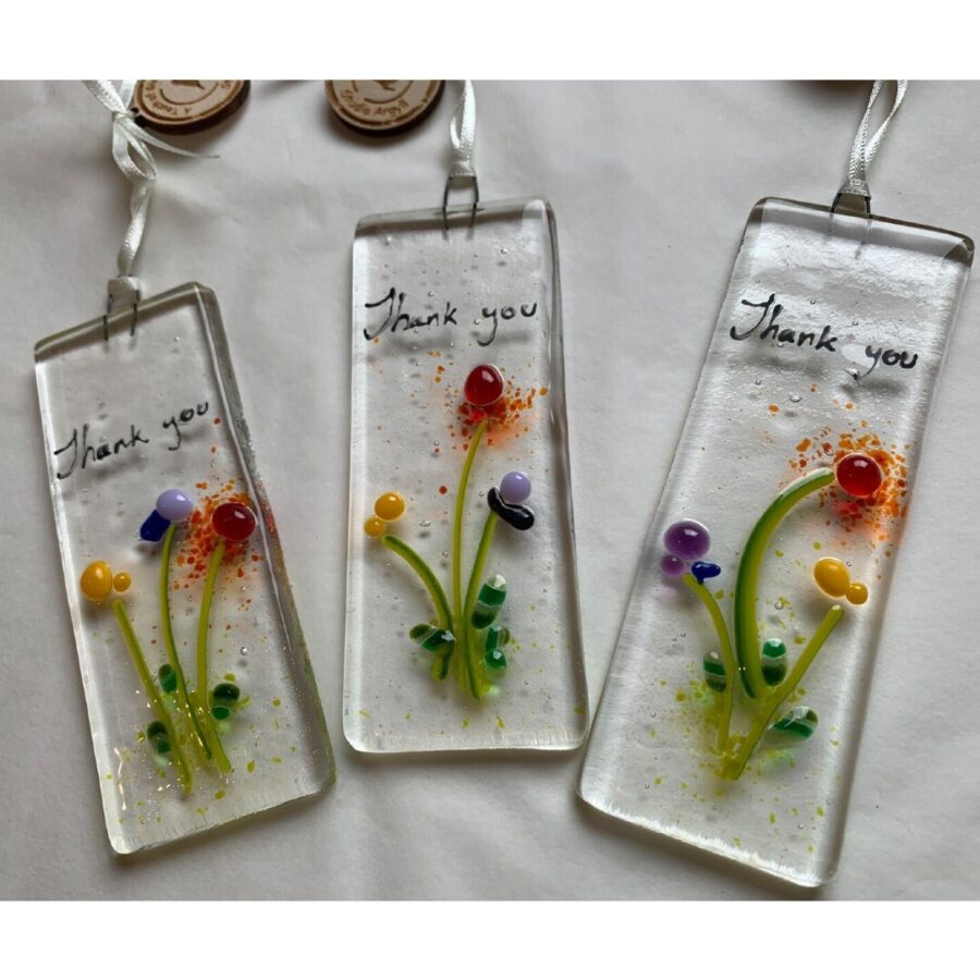 A sweet fused glass thank you gift that will brighten someones day. It is made with hand cut and decorated pieces of glass that have been kiln fired.