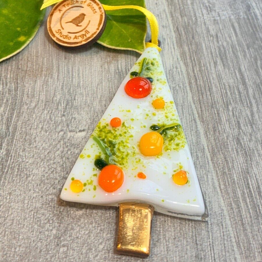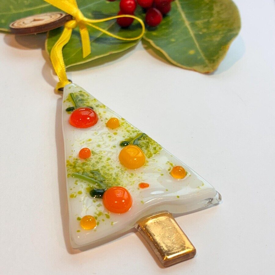 A beautiful handmade fused glass tree decoration of a Christmas tree with oranges and lemons. Made with fused glass and hand painted parts carefully assembled and kiln fired.