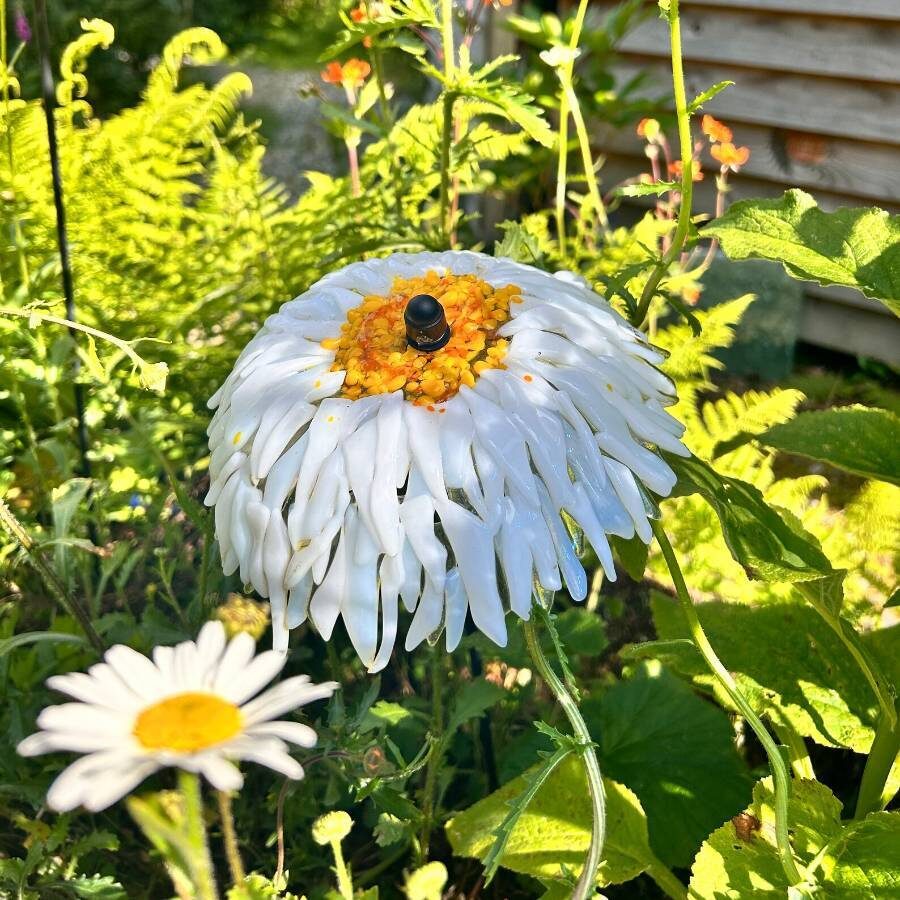 A beautiful fused and slumped glass garden stake, carefully assembled to produce this delicate white daisy. Attached to a powder coated steel rod. Suitable for use in the garden all year round, in a sheltered spot from the wind.