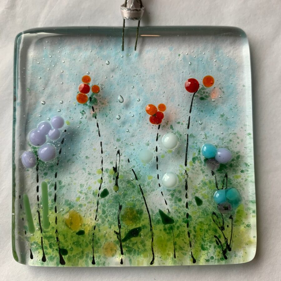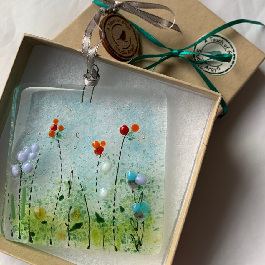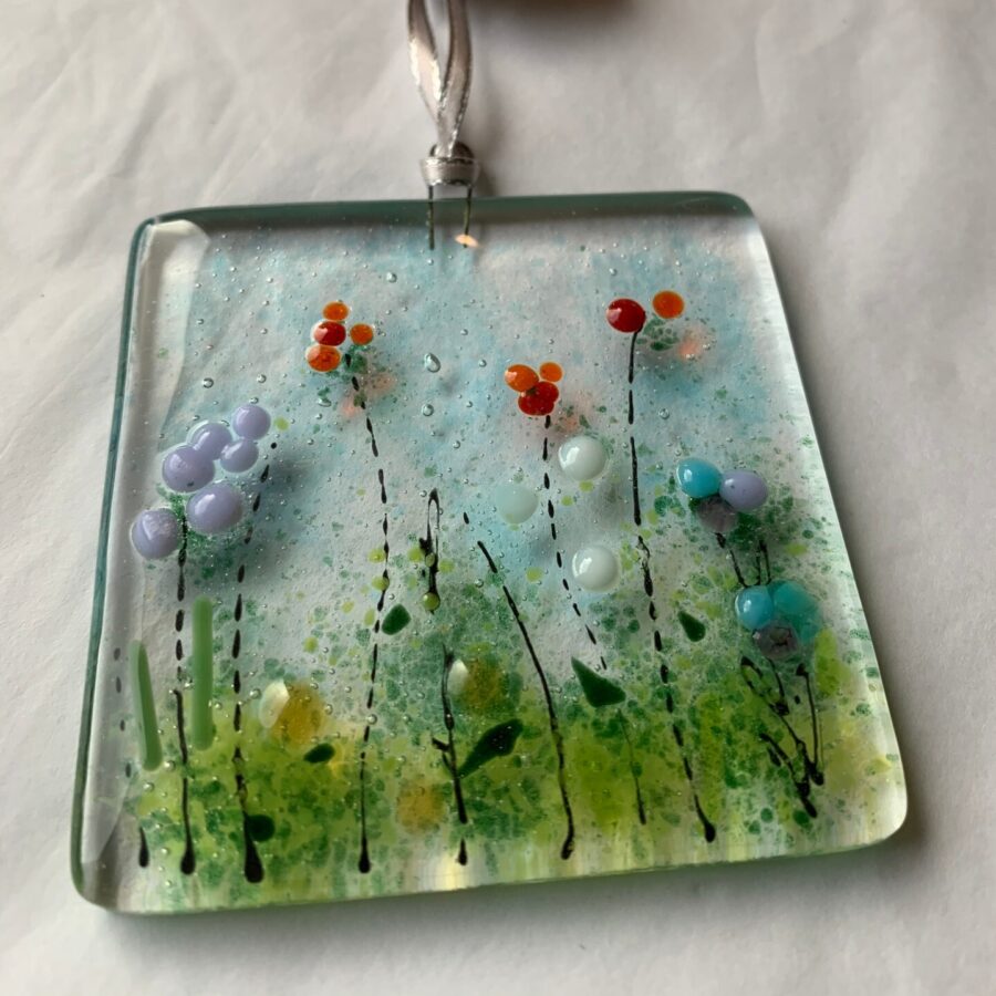 A fused glass wild flowers hanging decoration. Hand painted and carefully assembled pieces of glass, before being kiln fired. Each will vary slightly in colour choice and design due to their handmade nature, making each one unique. Each decoration is strung with white satin ribbon and finished with A Touch of Glass Studio logo tag.