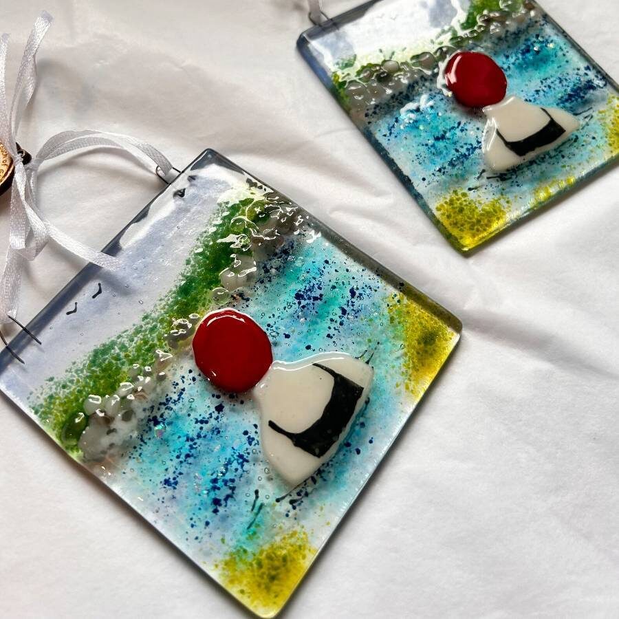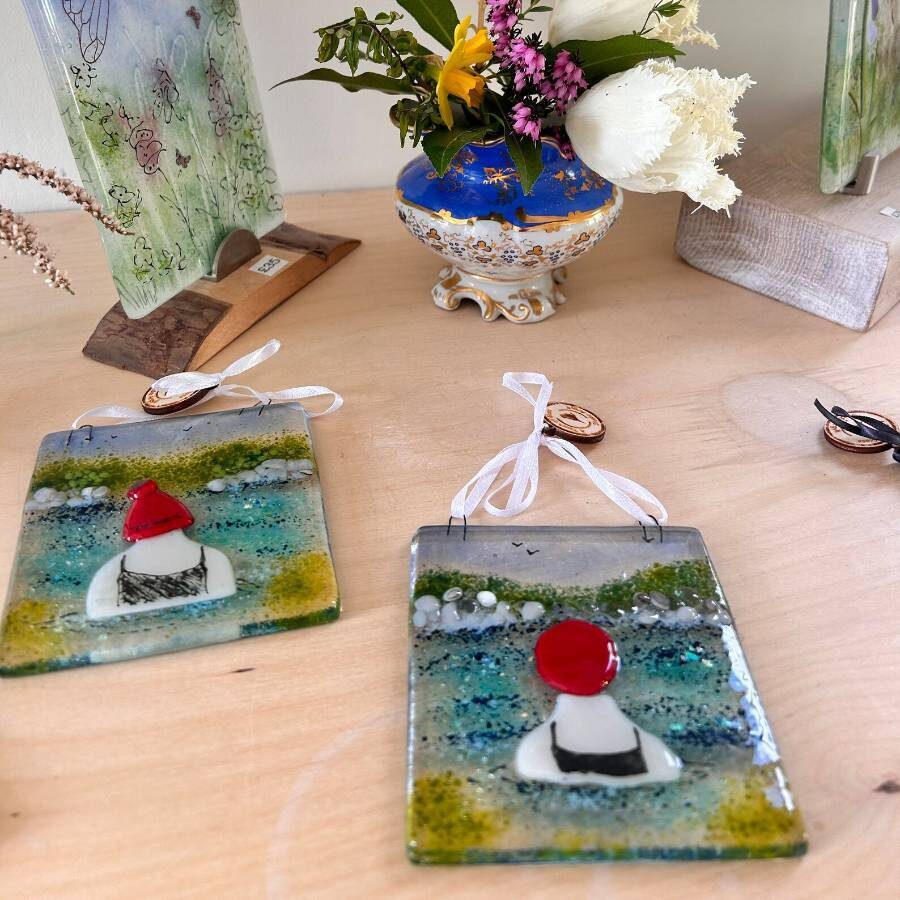 A fused glass decoration featuring a little wild swimmer with red swim cap, amongst the gentle waves of blue and turquoise. do you have a wild swimmer or little dipper in your life? this could be a perfect gift!