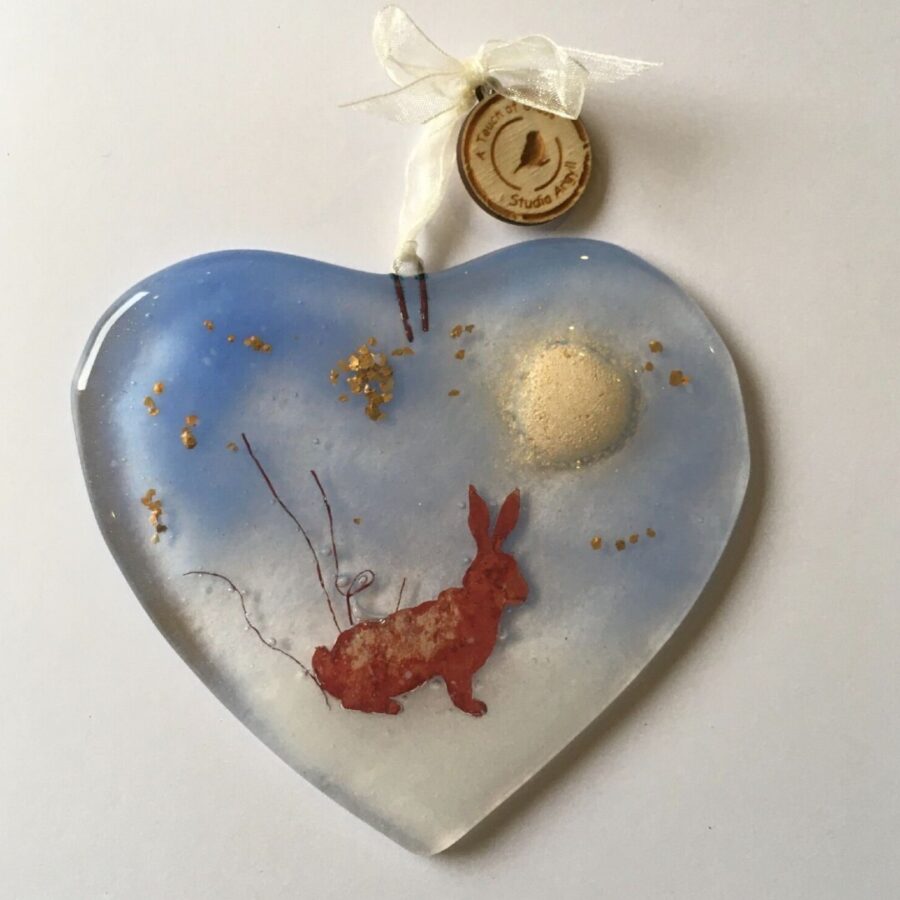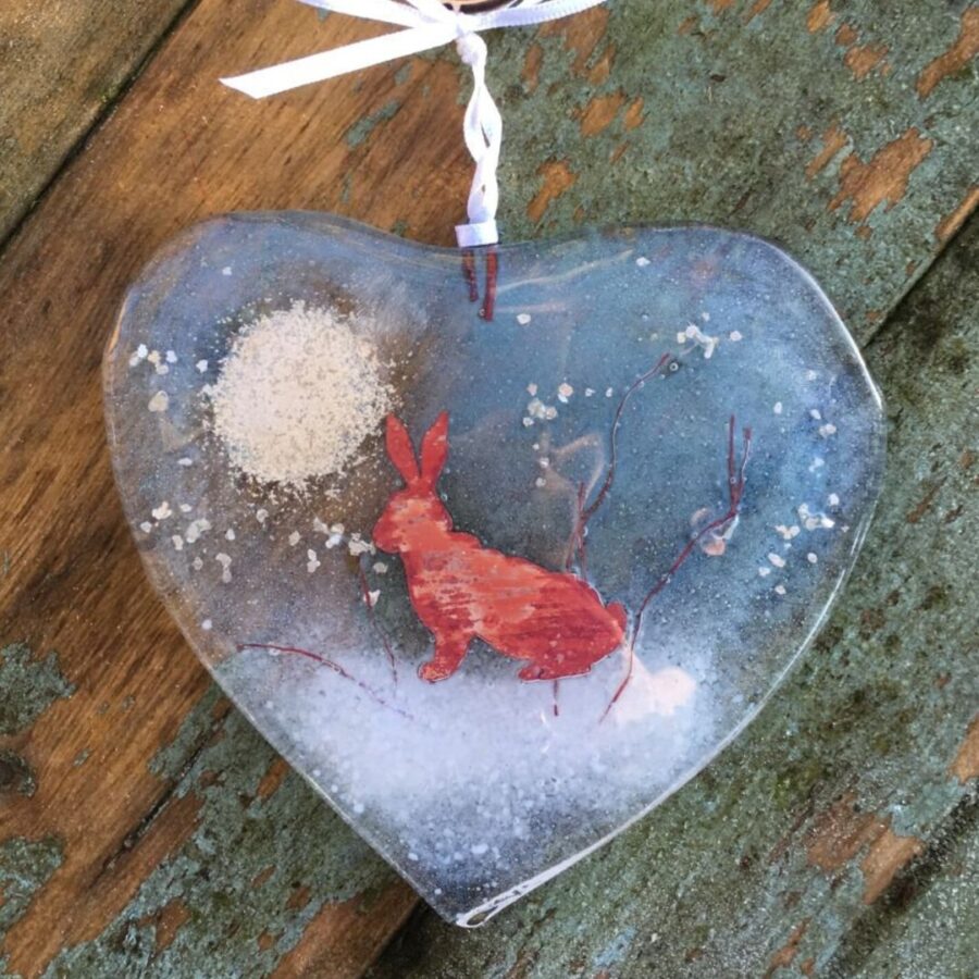 A beautiful fused glass decoration featuring an iconic hare and moon. Soft blue and shimmery whites, surrounded by falling snow gives this piece a winter wonderland feel. It is made with hand cut and decorated pieces of glass that have been kiln fired.