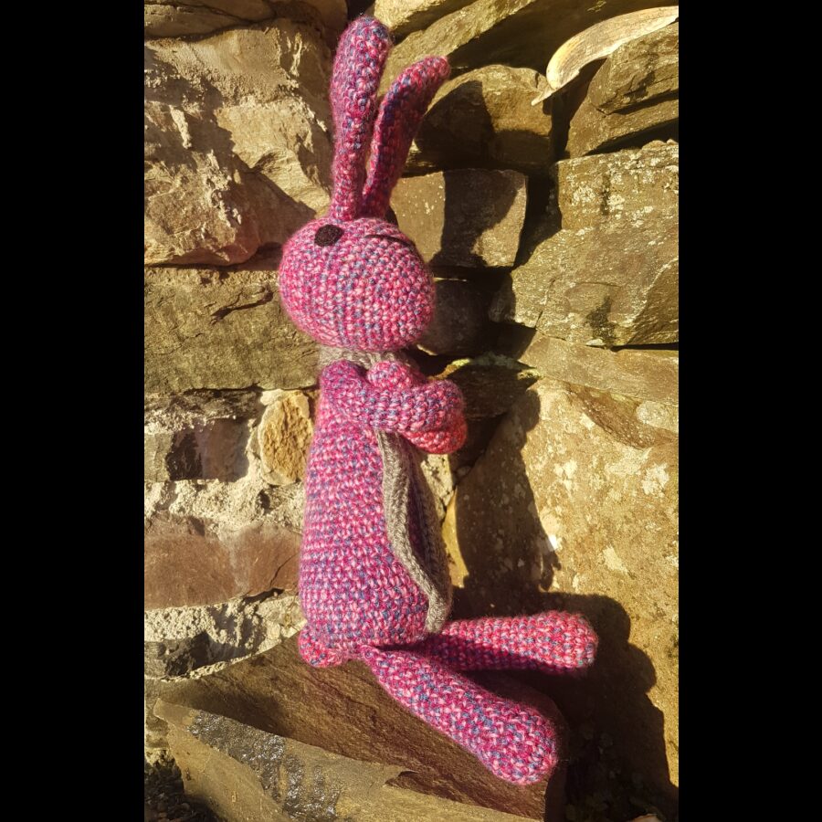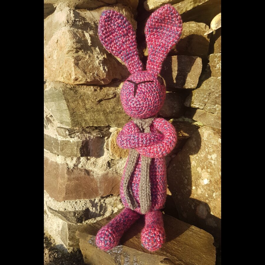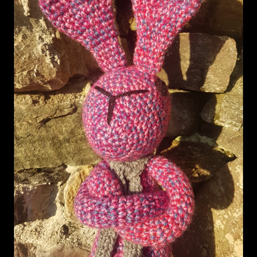 Please meet Gail of the McCoineanach clan. Coineanach means 'rabbit' in Scottish Gaelic. This clan is constantly growing. "Gail" means "joy". Gail is crochet in lovely pink/blue acrylic yarn and has crochet black eyes. She also wears a long grey scarf. Each bunny is unique in name as well as colours. Gail is 54cm tall and can sit upright by herself. This would be a lovely gift for anyone between 0-100.