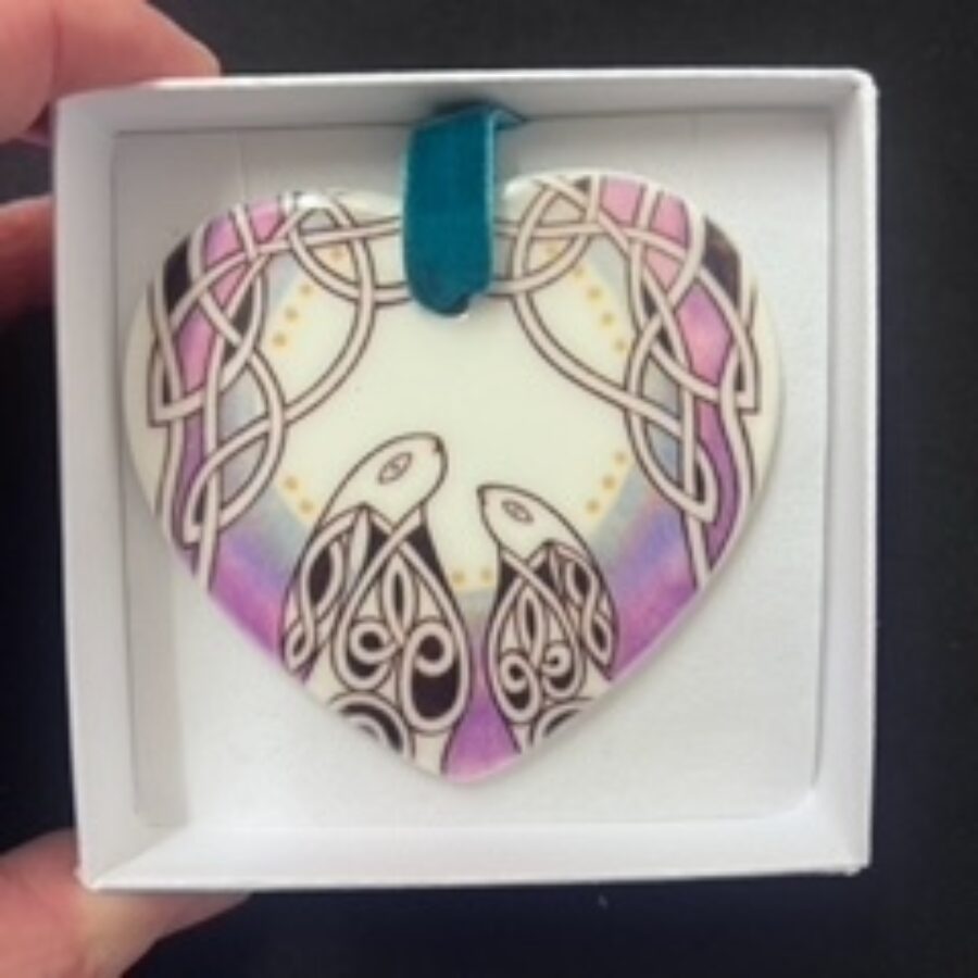 A beautiful ceramic hanging decoration featuring an original design of gazing hares by Highland Celtic Art. The ribbon may vary but will either come in a complimentary tartan or velvet and is 1 cm in diameter. Each hanger comes boxed.