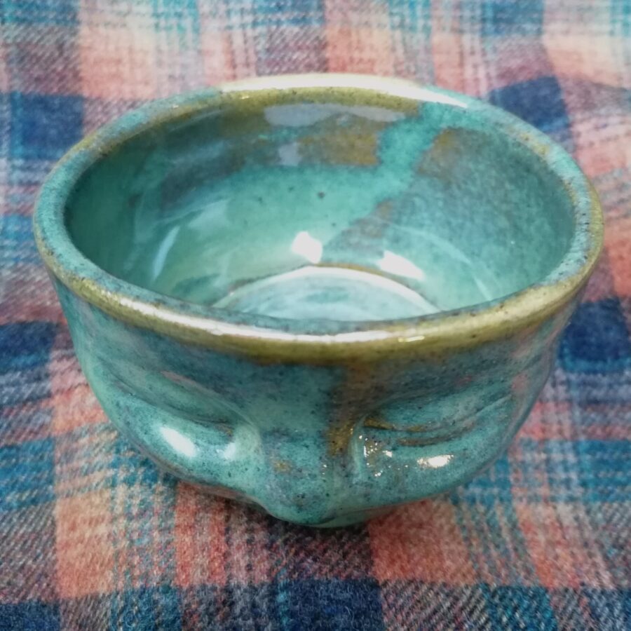 A small, green, stoneware pot with a face sculpted in by hand. Hand thrown on the wheel. Food safe. Dishwasher and microwave safe.
