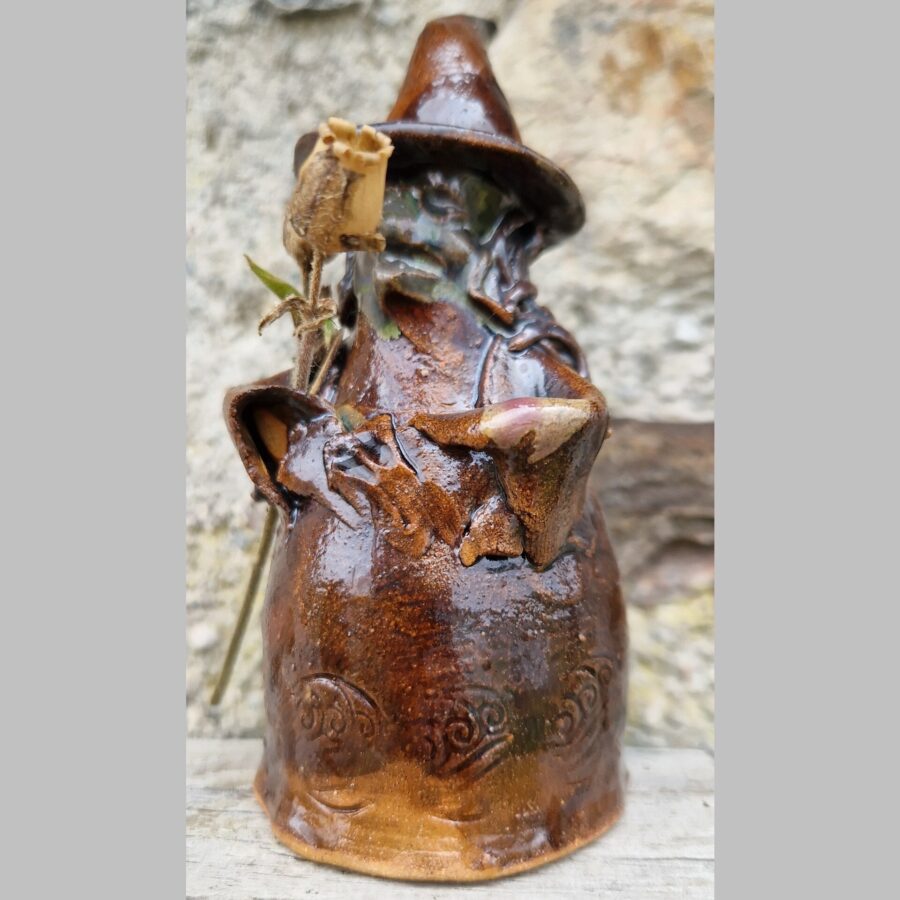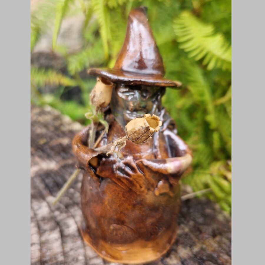 A cute Halloween witch who holds a flower as a broomstick, hand thrown on the potters wheel.