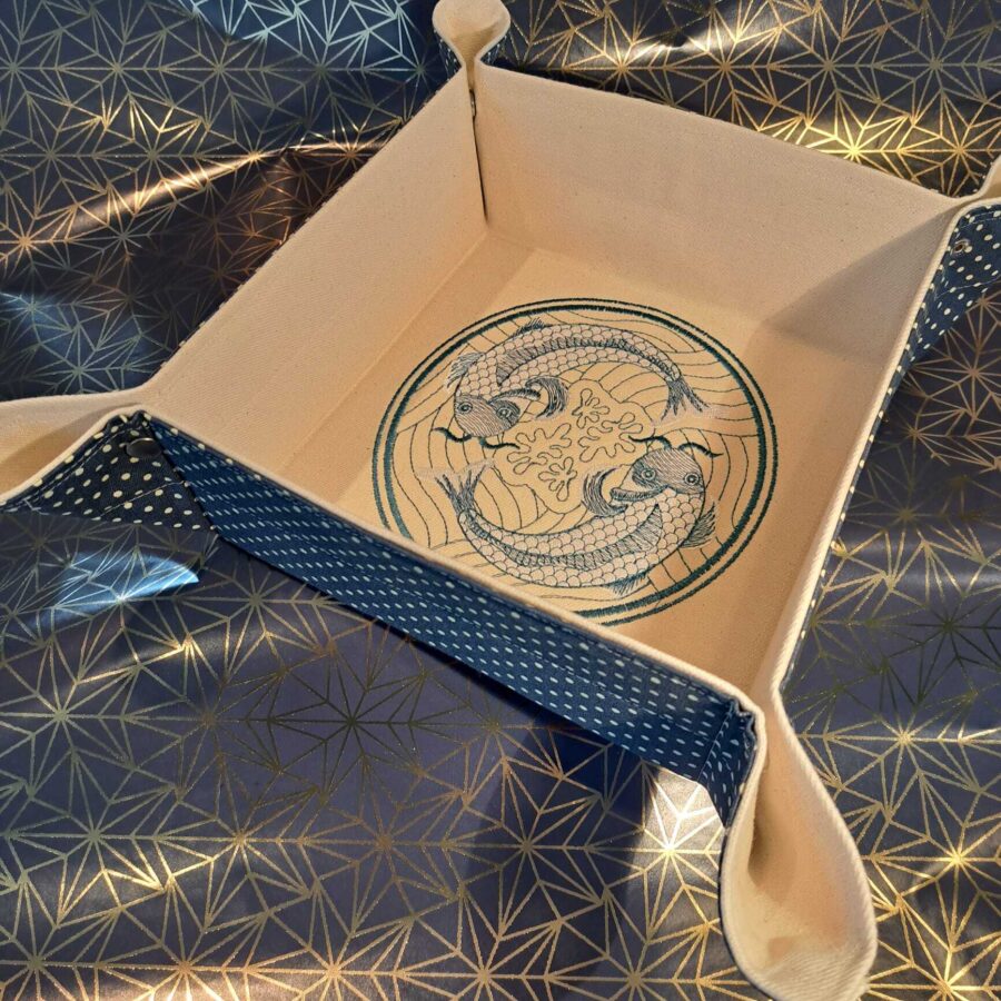 This fabric basket has a multitude of practical users about the home. It is a great storage container which, when not in use, can be stored flat. The central koi fish design was created by machine embroidery. This fabric basket makes the ideal hamper to fill with gifts for all occasions, whilst also being a gift in its own right. It is made from 100% cotton fabric.