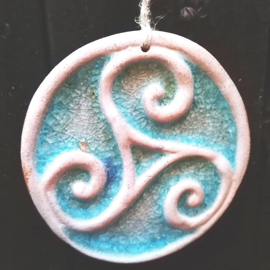 A Celtic Triskel, hanging disc in white with turquoise melted glass. Finished with jute. Hand moulded.
