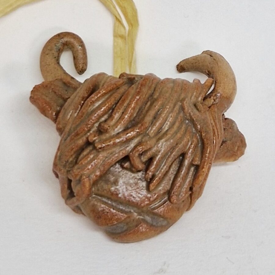 A wee hanging decoration in the shape of a hand sculpted Highland Cow.